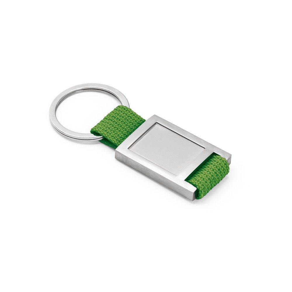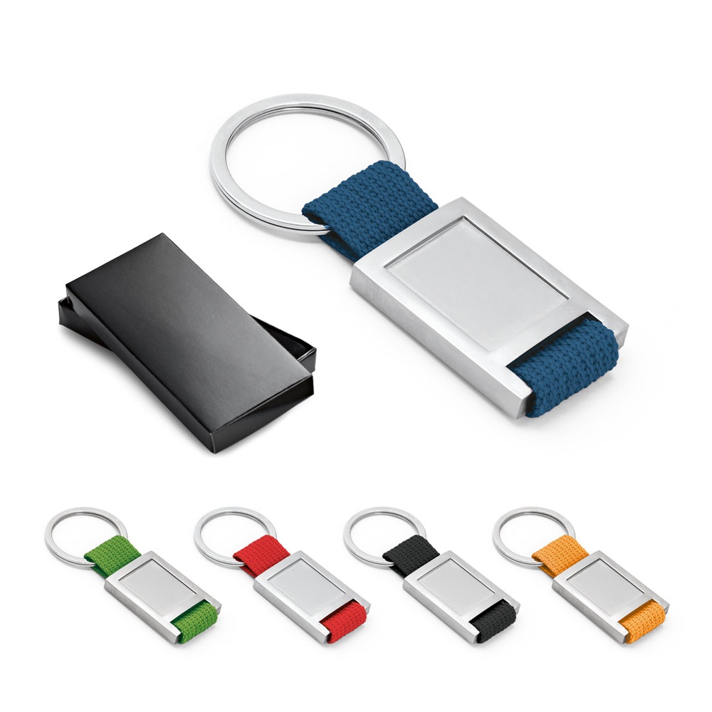 Llavero de metal y tela webbing con encaje para doming. Suministrado en caja de presentación
