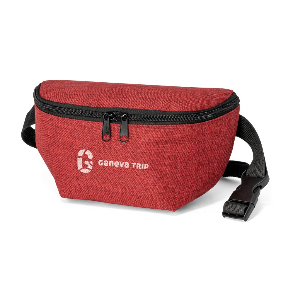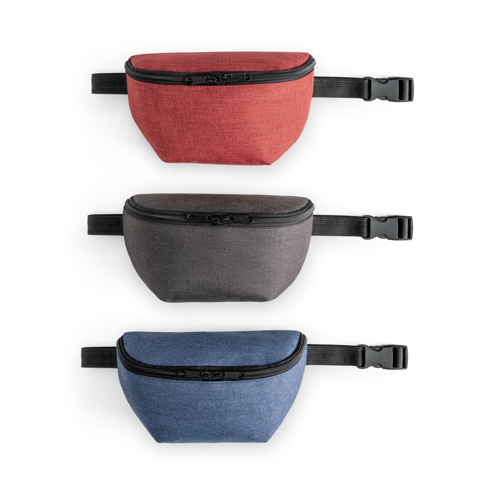 Riñonera fabricada en poliéster 600D de alta densidad con compartimento principal y cremallera frontal. Tiene correa ajustable con cierre
