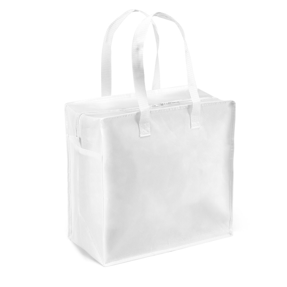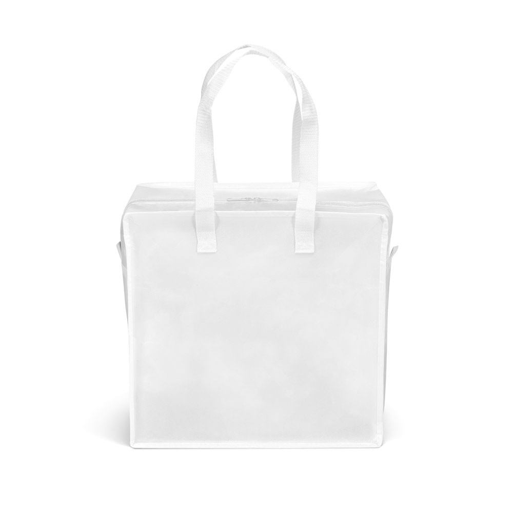 Bolsa fabricada en no tejido (Non woven laminado brillante 140g/m²) con cierre de cremallera. Dispone de un encaje para trolley, fondo reforzado un asa tipo webbing de 65 cm.350 x 350 x 200 mm