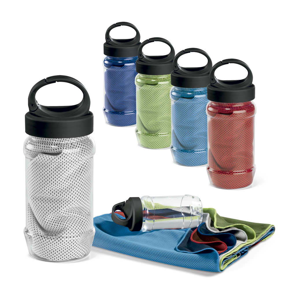 Conjunto que incluye una botella hecha en PP y PET y una toalla refrescante deportiva de poliamida y poliéster. La botella incluye un práctico gancho que permite llevarla a cualquier parte, con una capacidad de hasta 440 ml. La toalla permanece fría durante unas horas cuando está mojada. Si se calienta, simplemente hay que agitarla para reactivar su frescura. Es reutilizable y puede lavarse a máquina