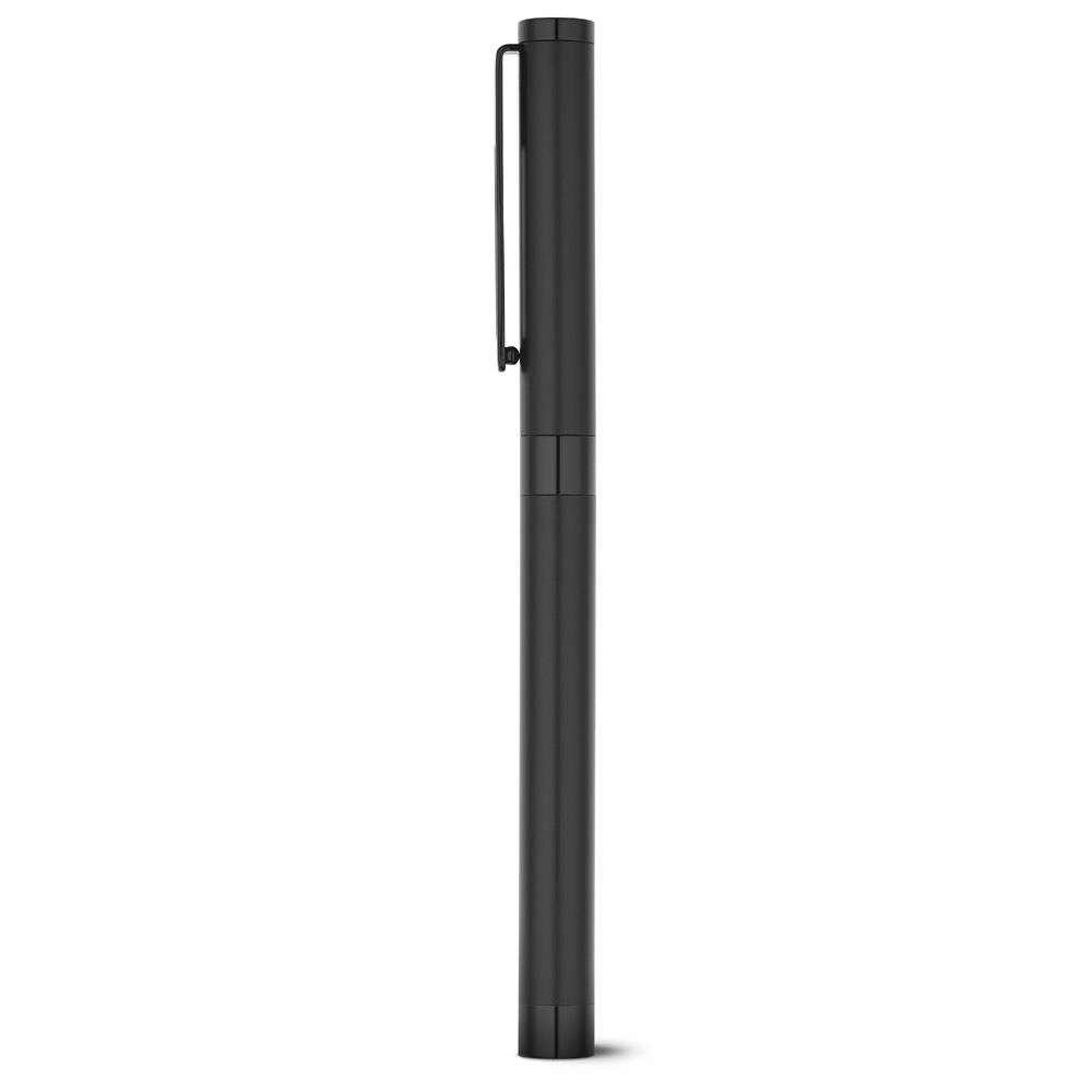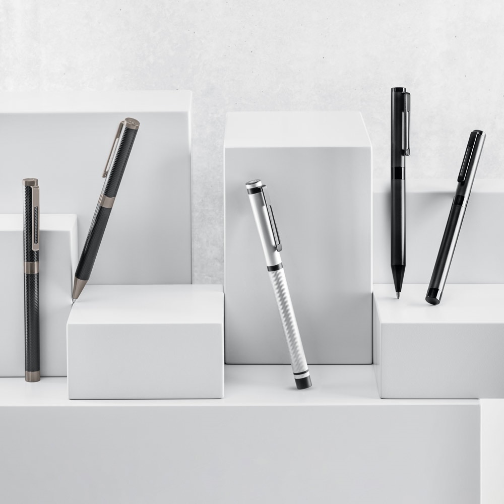 El AUTOGRAPH es un sofisticado juego de bolígrafo y roller. El roller es de metal negro mate y su tapa posee un clip de acero inoxidable. El bolígrafo es de metal negro mate con clip de acero inoxidable. En este conjunto minimalista y elegante, el bolígrafo y el roller disponen de una recarga Dokumental Ink® en tinta en azul. Se suministra con caja de regalo
