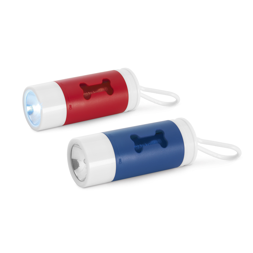 Dispensador de bolsas hecho en ABS con 20 bolsas de plástico higiénicas para perros. Contiene linterna LED y mosquetón. Incluye 3 baterías LR1130.Porta bolsas: ø40 x 100 mm | Bolsas: 265 x 310 mm