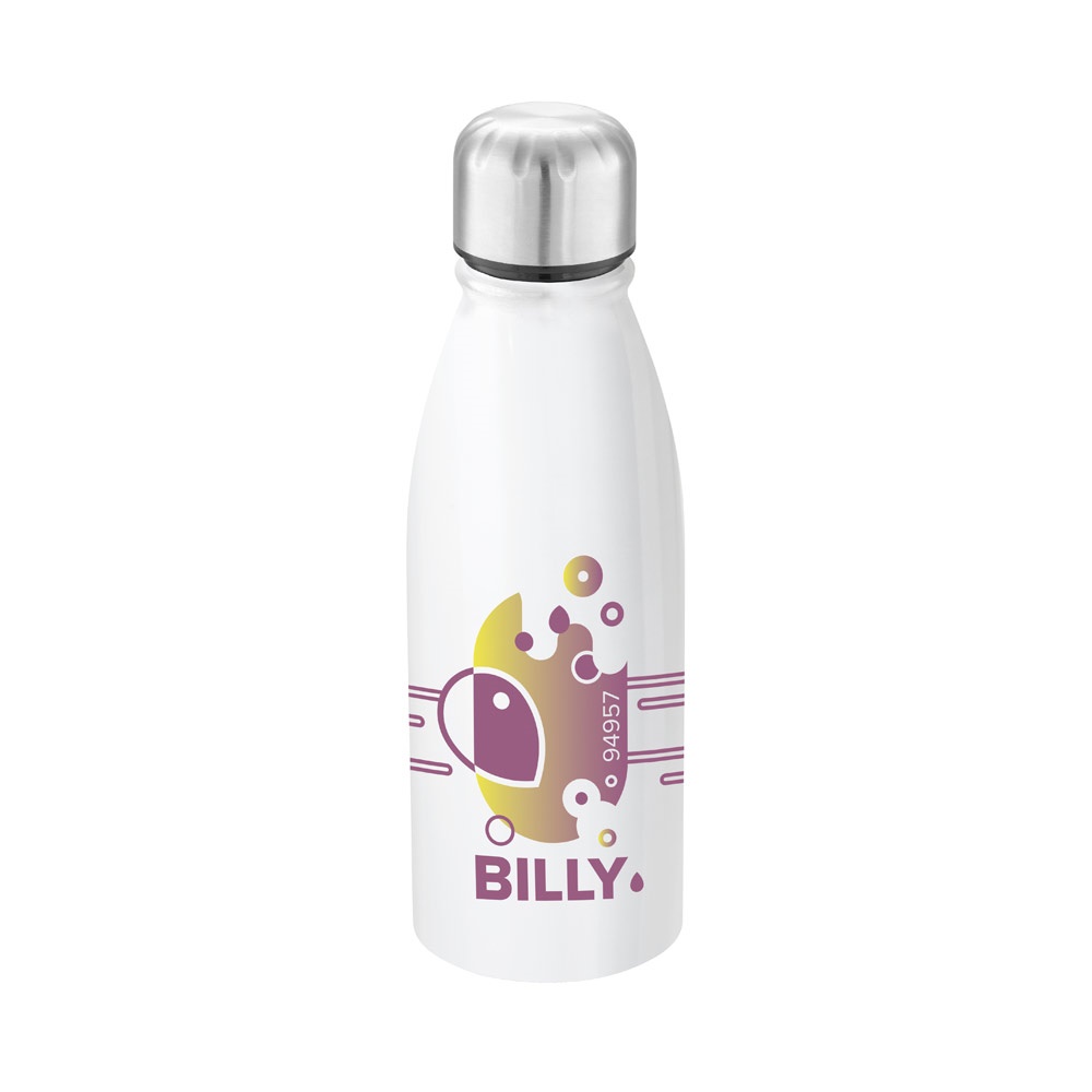 Botella de aluminio, apta para sublimación, con tapón de acero inoxidable y una capacidad de hasta 500 ml. Se suministra en una caja blanca