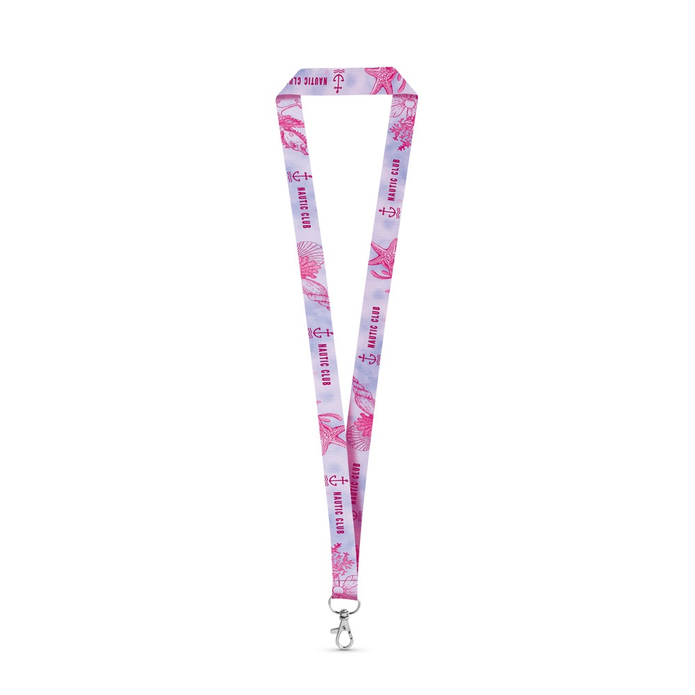 Landyard para sublimación en poliéster con mosquetón. La personalización puede realizarse en ambos lados de la cinta