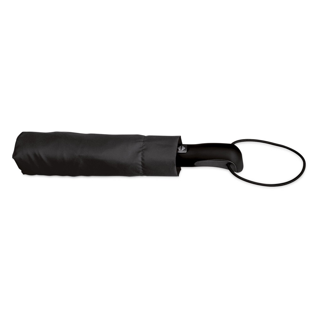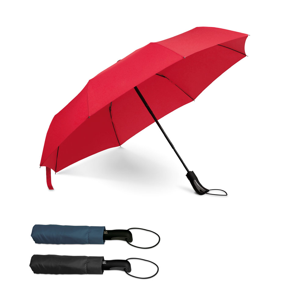 Paraguas plegable de poliéster pongee 190T con mango de goma y apertura y cierre automáticos. Se suministra en funda