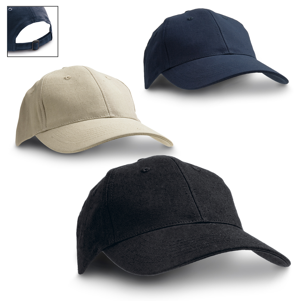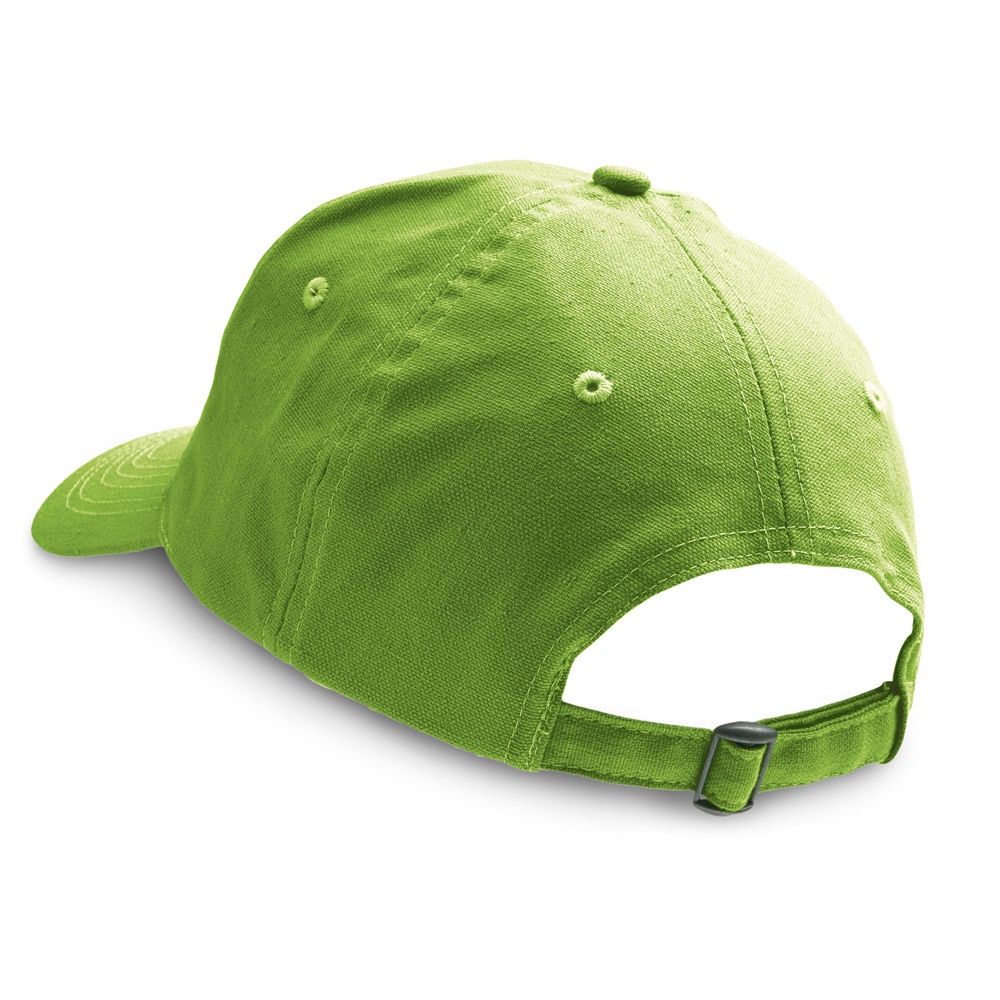 Gorra de lona de algodón 100%, con 6 paneles y orificios de ventilación. Ajustable con hebilla de metal