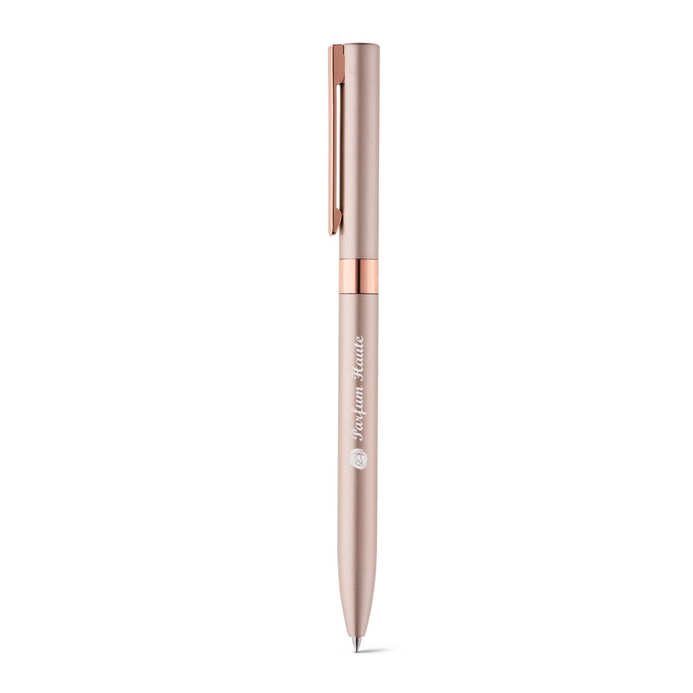 Bolígrafo con mecanismo de giro, fabricado en aluminio con original gama de color y escritura de color negro.ø10 x 140 mm