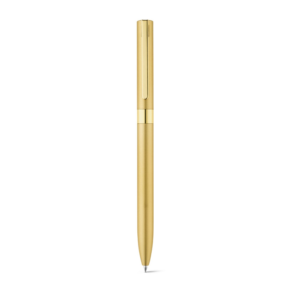 Bolígrafo con mecanismo de giro, fabricado en aluminio con original gama de color y escritura de color negro