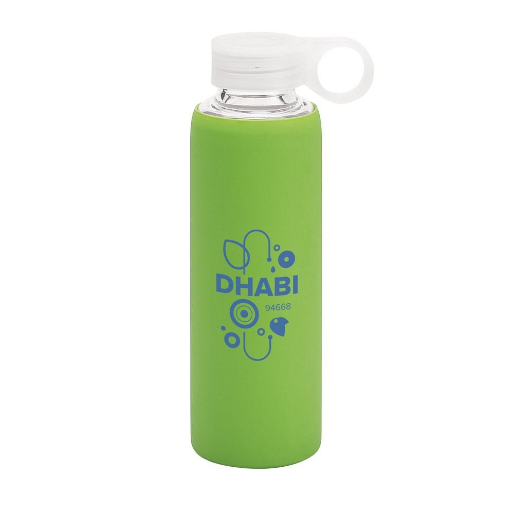 Botella de vidrio de borosilicato con tapa hecha en PP y cierre de rosca. Incluye una funda protectora de silicona. Capacidad de hasta 380ml. Suministrada en caja de cartón