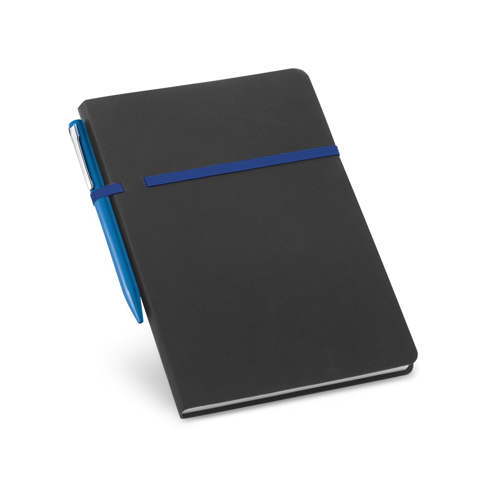 Libreta A5 en polipiel con 192 páginas lisas y soporte para bolígrafo (incluido, tinta azul). Se suministra en una bolsa de no tejido (non woven) a juego con el color del elástico y el bolígrafo