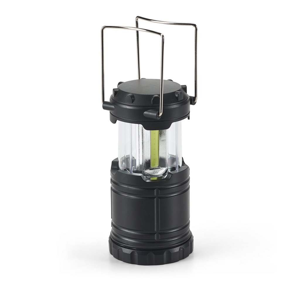 Linterna de camping hecha en ABS con 3 LED COB y asas de metal. Incluye 3 pilas AAA. Se suministra en caja