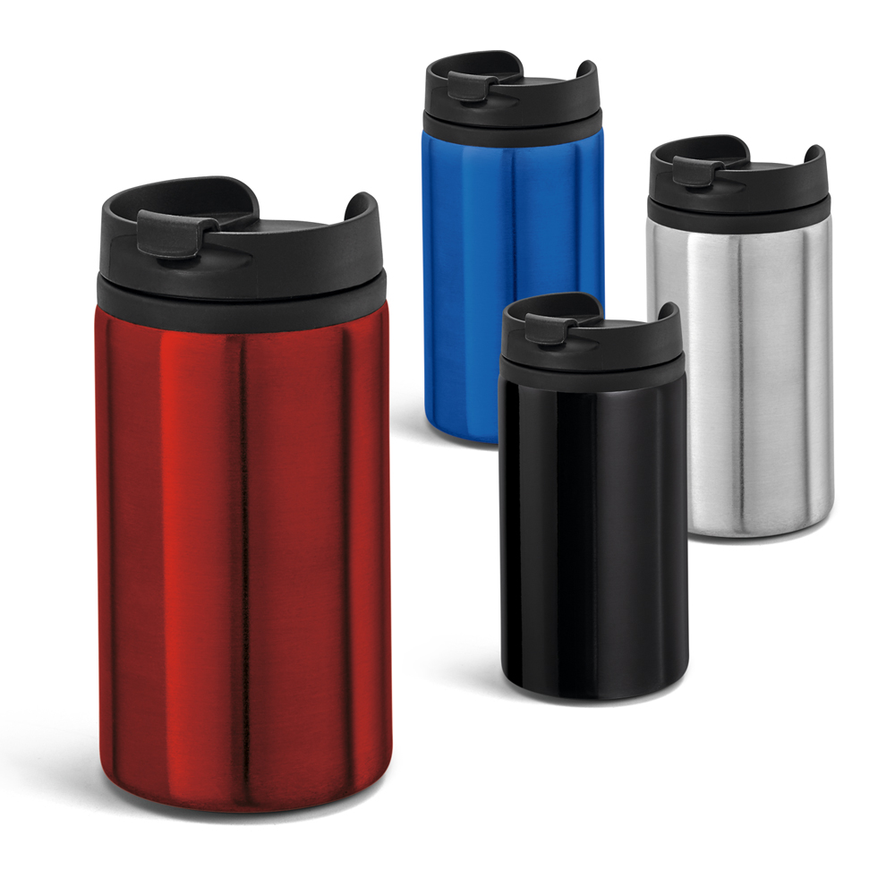 Vaso de viaje fabricado en acero inoxidable y PP. Dispone de pared doble, tapa y base con antidesliazante. Capacidad de hasta 310 ml