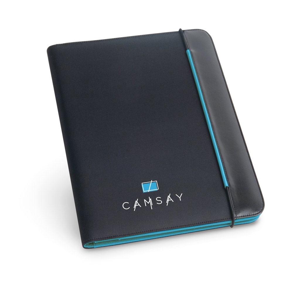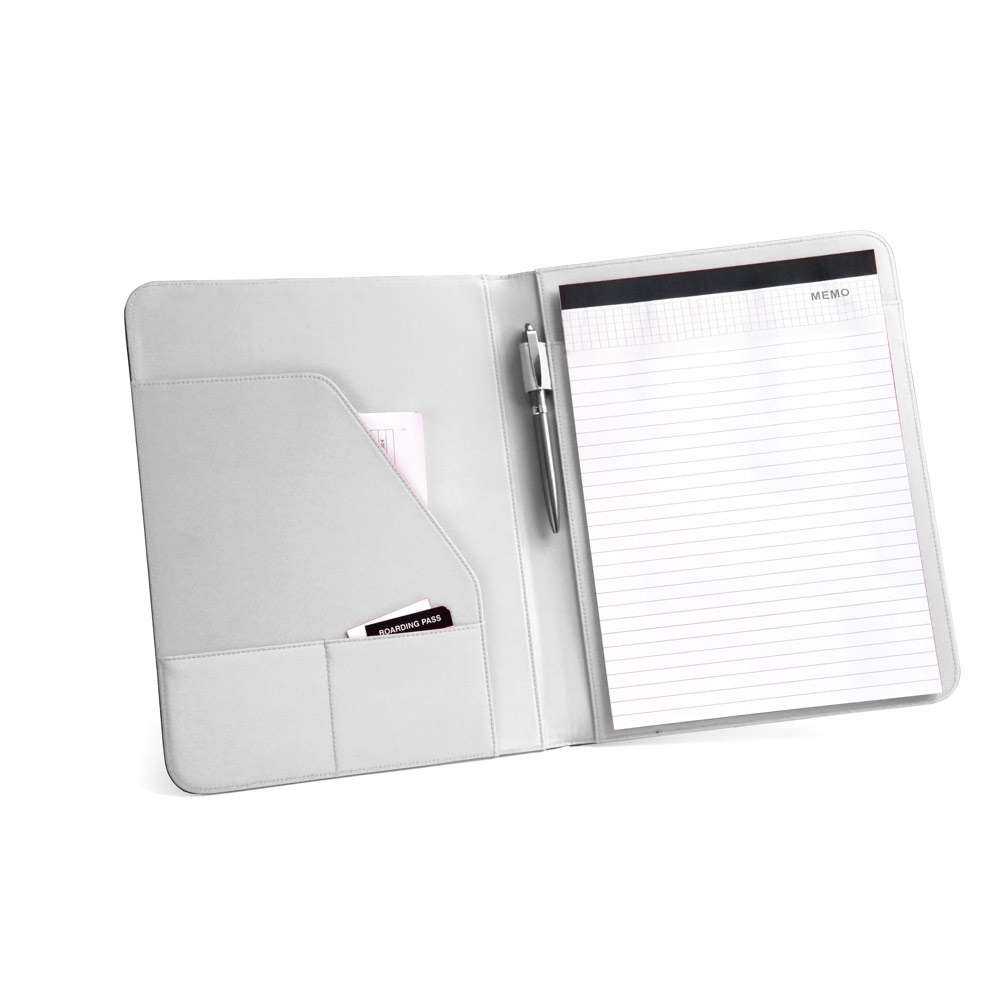 Carpeta A4 hecha en polipiel y 800D con interior de microfibra. La carpeta dispone de un elástico para cerrar, un bloc de 20 hojas pautadas, 3 bolsillos y soporte para bolígrafo (no incluido)