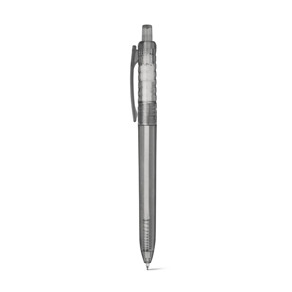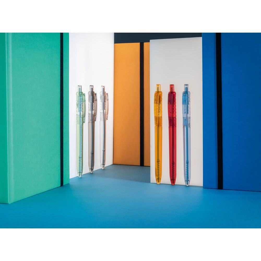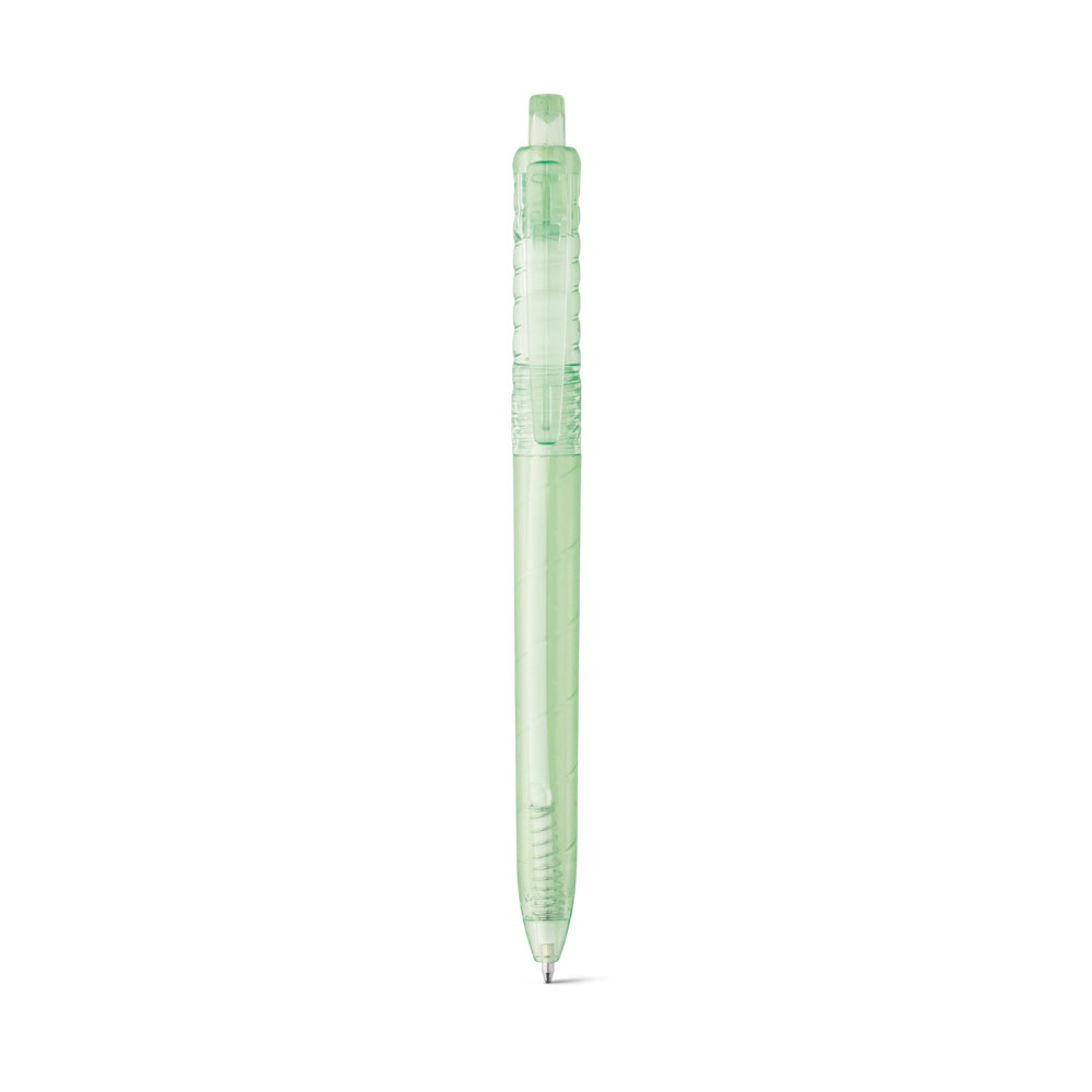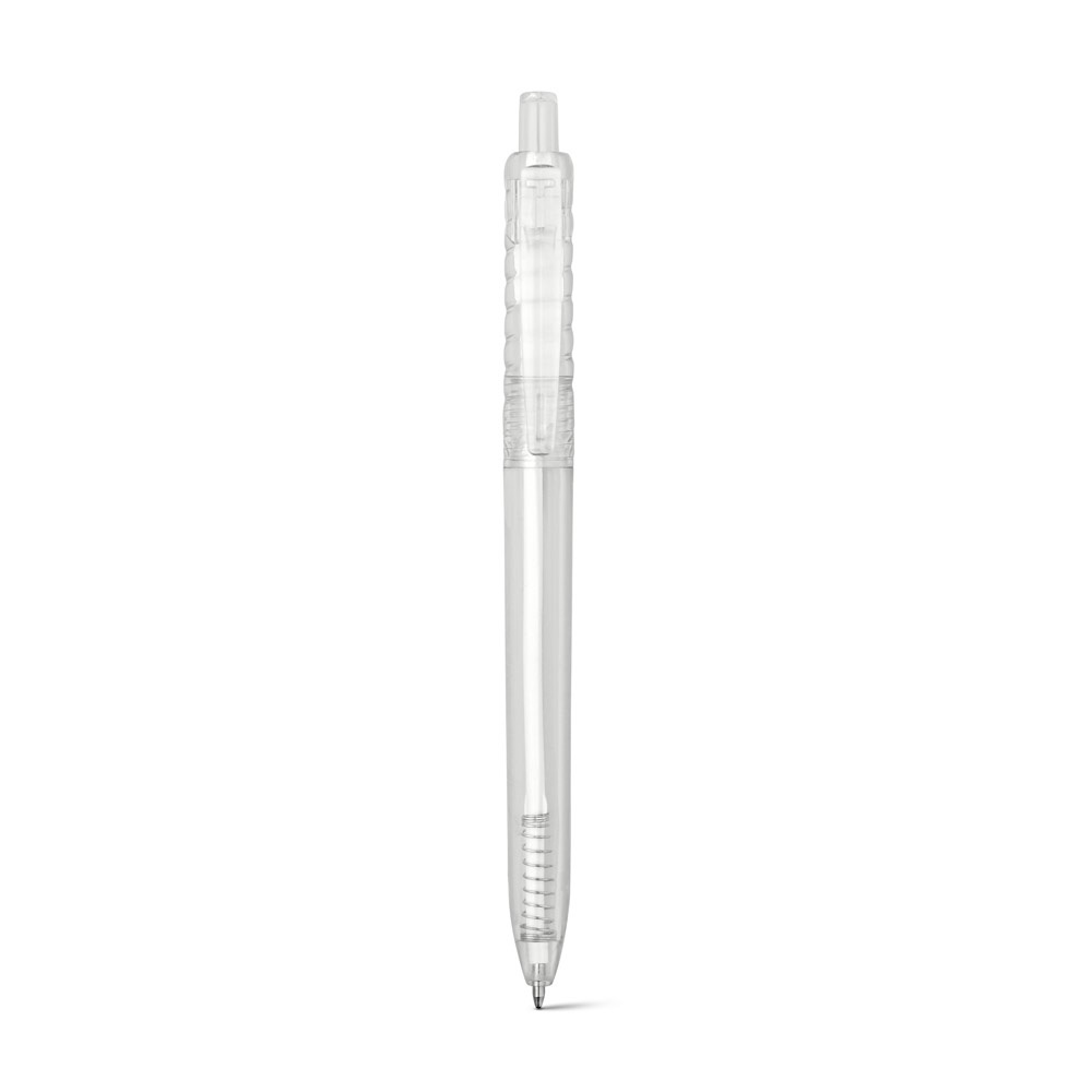 Bolígrafo hecho en material PET reciclado, translúcido y en una amplia gama de colores. Escritura en color azul