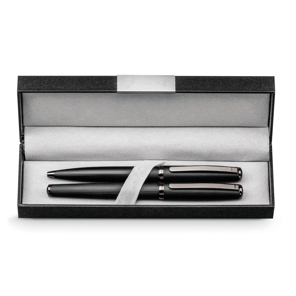 Set de boligrafo y roller de metal. El bolígrafo tiene mecanismo de giro y el roller capuchón. Se suministra en estuche de regalo. Escritura azul.Bolígrafo: ø13 x 137 mm | Roller: ø13 x 137 mm | Caja: 180 x 30 x 56 mm