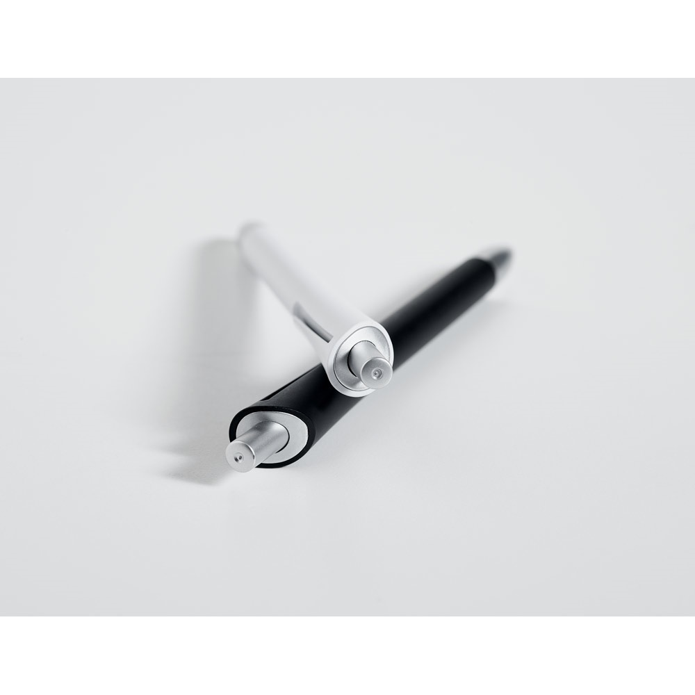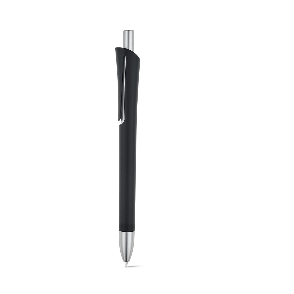 Bolígrafo fabricado en ABS de original diseño cónico. Detalles plateados a contraste. Escritura en color negro