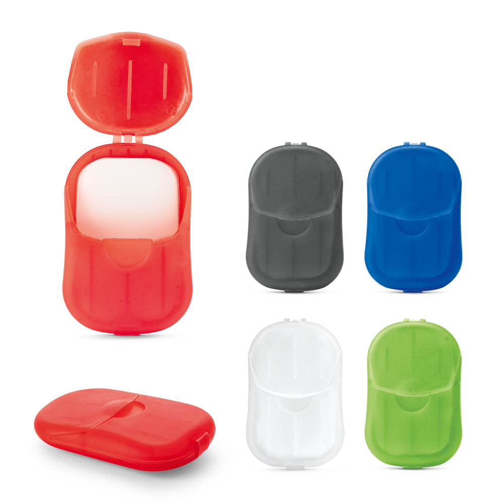 Estuche hecho en PP con 20 hojas de jabón. Para su uso, simplemente hay que agregar agua a la hoja de jabón y lavarse las manos. Es un producto cosmético.70 x 43 x 16 mm