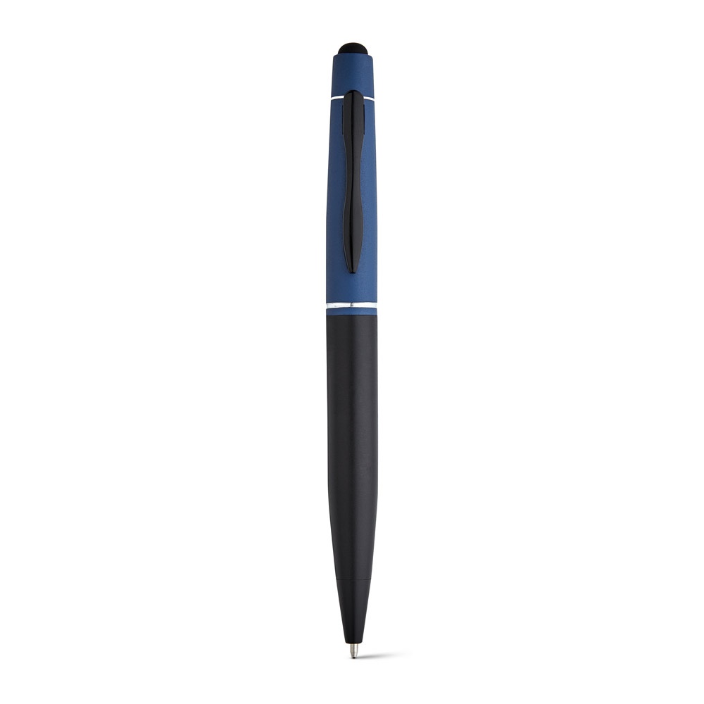 Bolígrafo fabricado en aluminio con mecanismo de giro y puntero táctil. Se suministra con estuche de cartón. Escritura azul