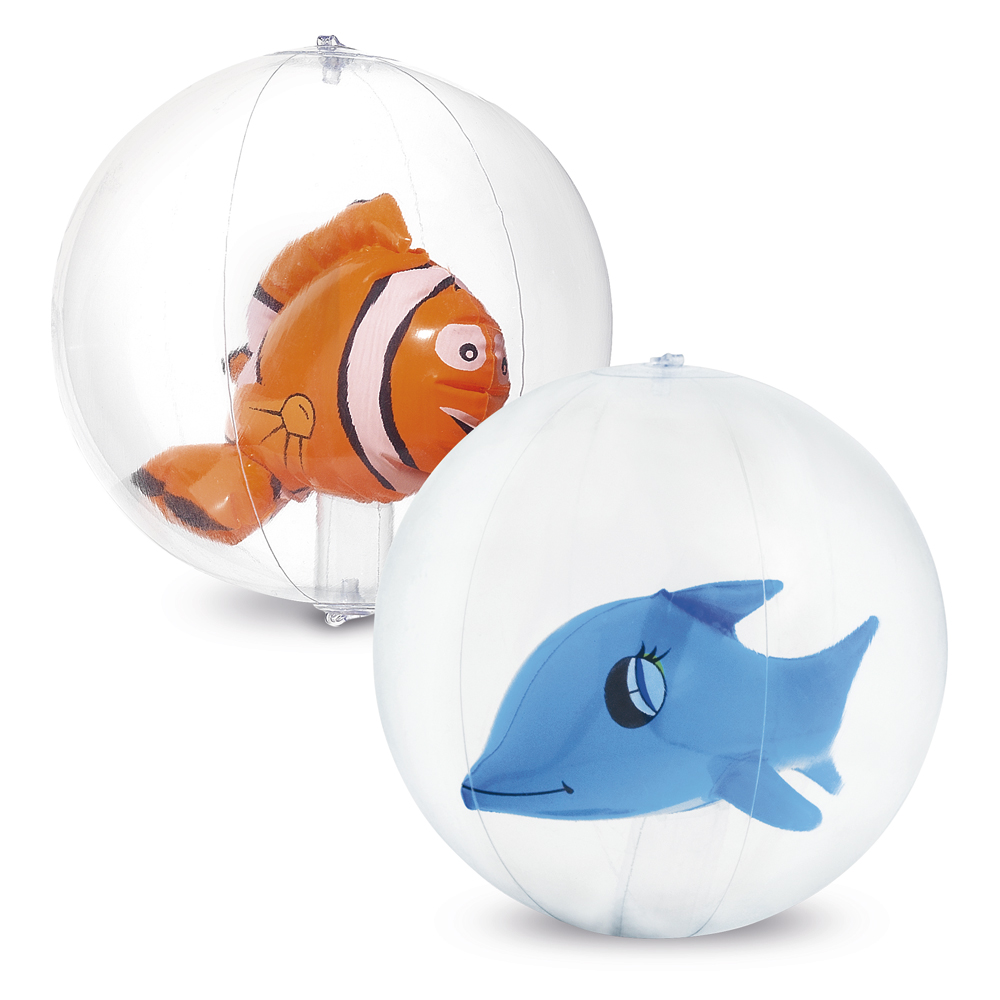Ref.: 50-98260-124Pelota de playa hinchable, hecha en PVC transparente, con muñeco en forma de pez en el interior