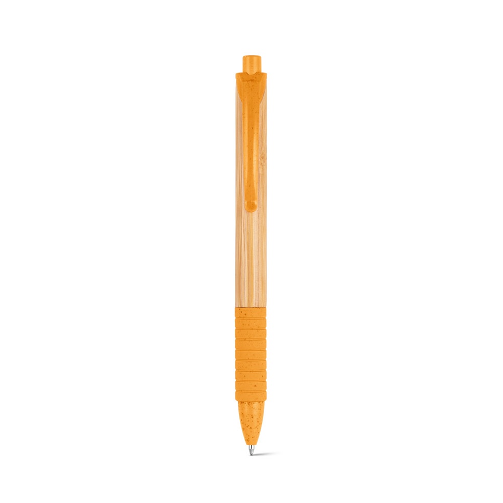 Bolígrafo de bambú con antideslizante, clip y tinta azul. Los elementos de color están hechos en fibra de trigo y ABS