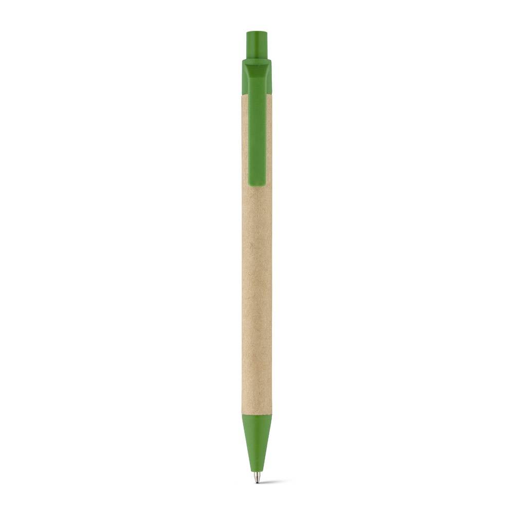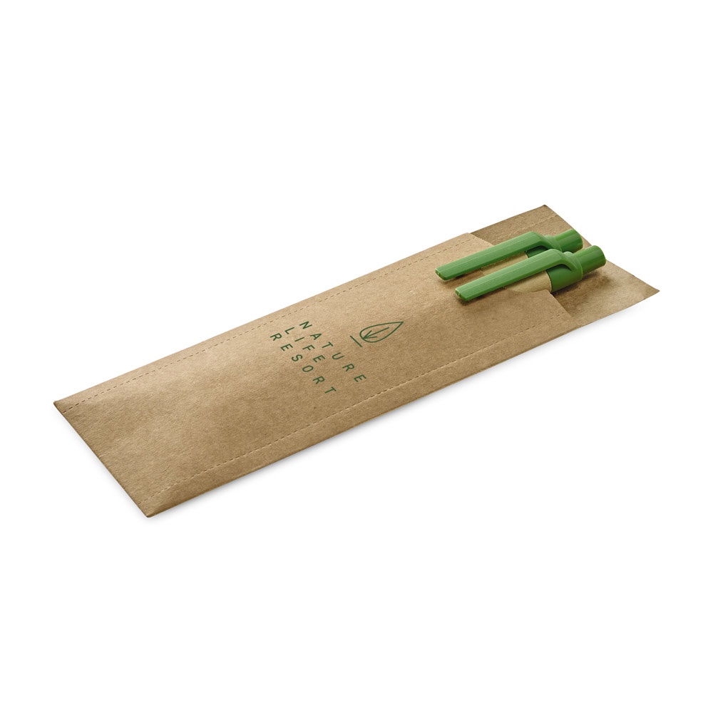 Juego de bolígrafo y portaminas en papel kraft, ambos productos con clip. Portaminas de 0,5 mm y bolígrafo con tinta azul. Se entrega con estuche de cartón.