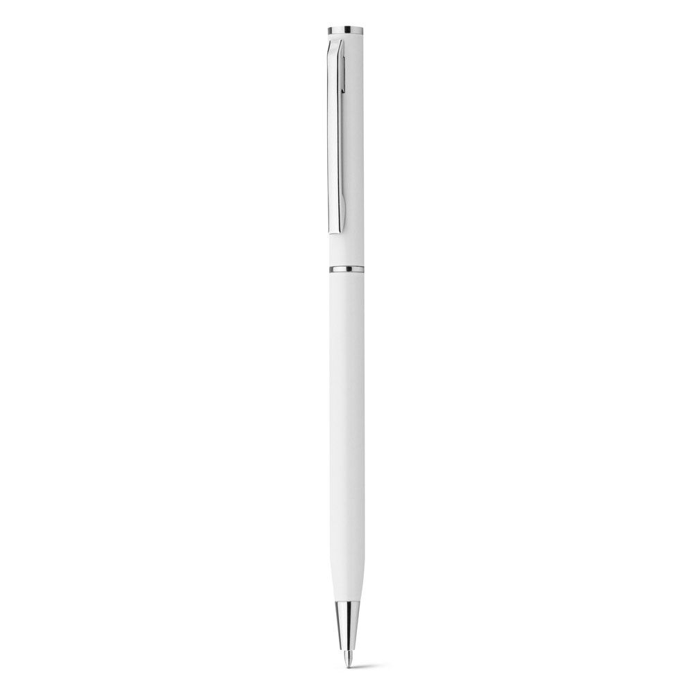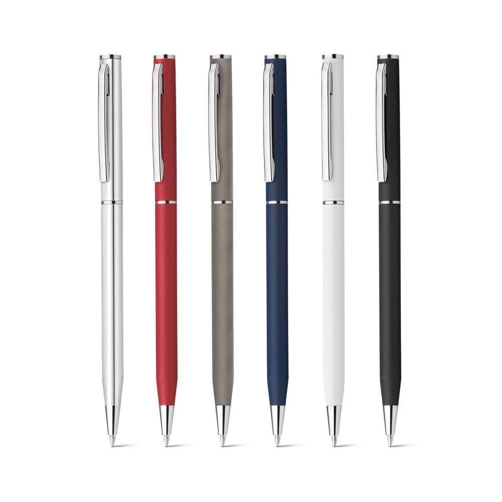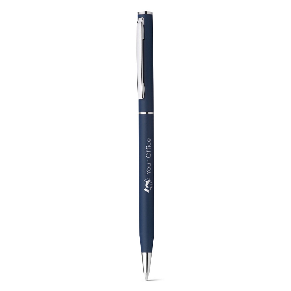 Bolígrafo de metal con mecanismo de giro. Escritura en color azul