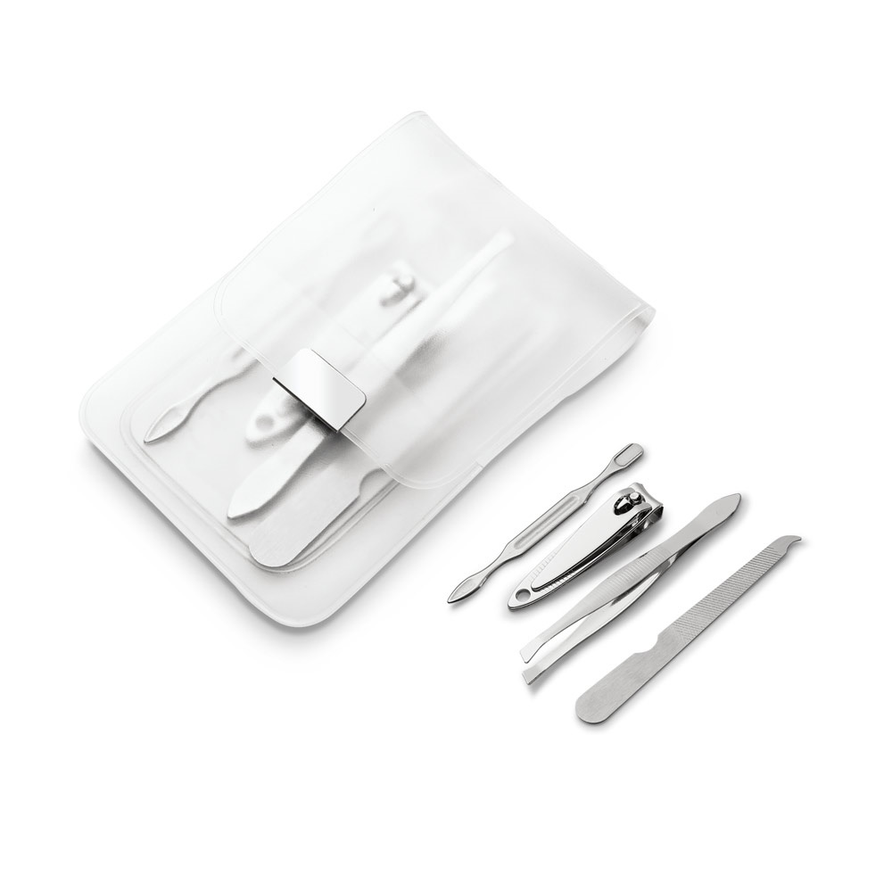 Conjunto de 4 piezas para manicura en bolsa de PVC, compuesto por lima, pinzas, cortauñas y separacutículas.66 x 105 mm