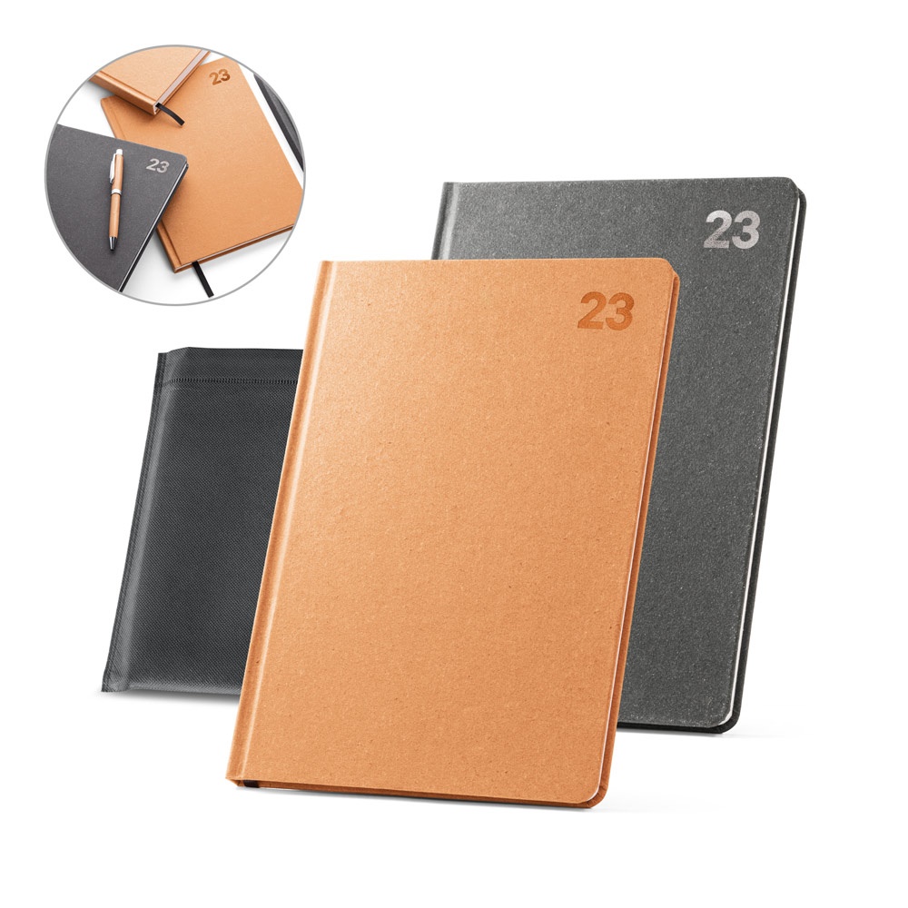 Agenda B5 en piel reciclada. Se suministra con funda de non-woven