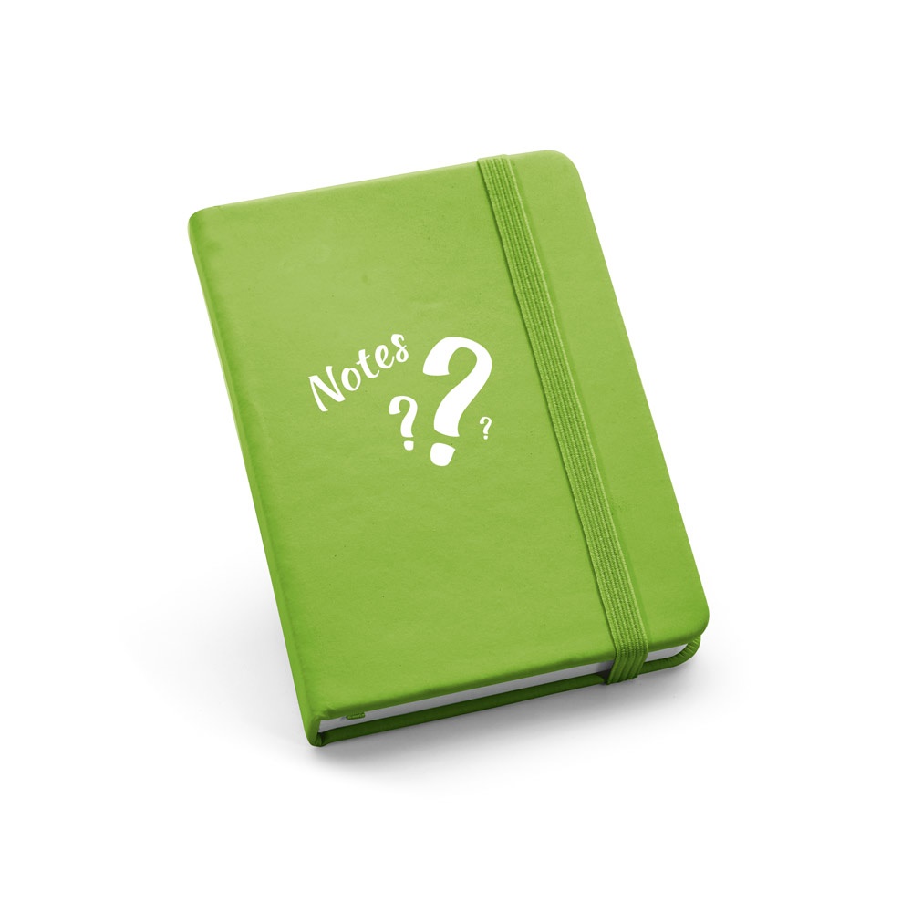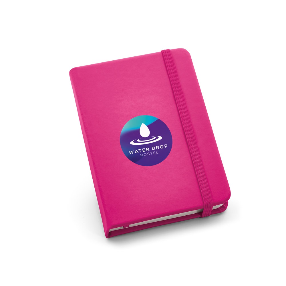 Bloc de notas de bolsillo con 160 páginas lisas, tapa dura en polipiel, cinta separadora y elástico.90 x 140 mm