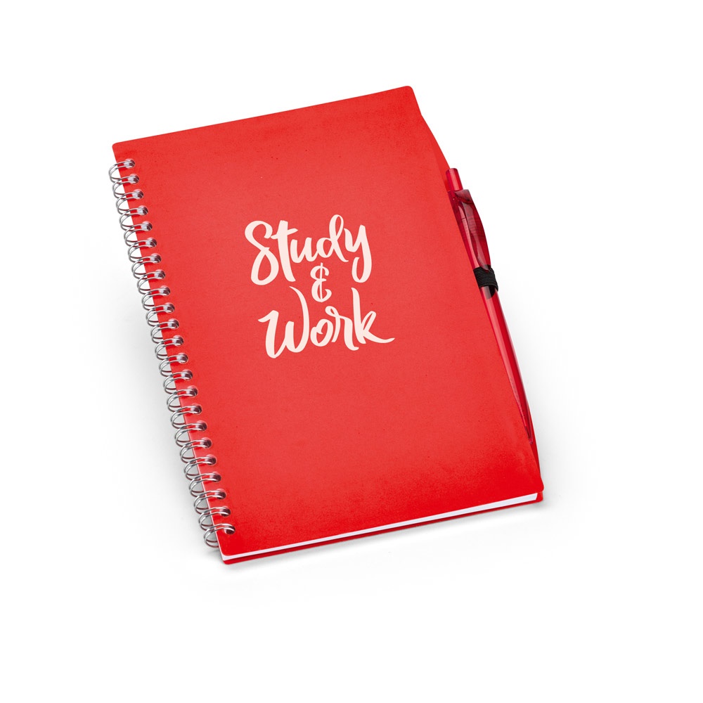 Bloc de notas A5 con espiral y tapa semirrígida de plástico PP. Incluye 140 páginas rayadas y un bolígrafo con tinta azul