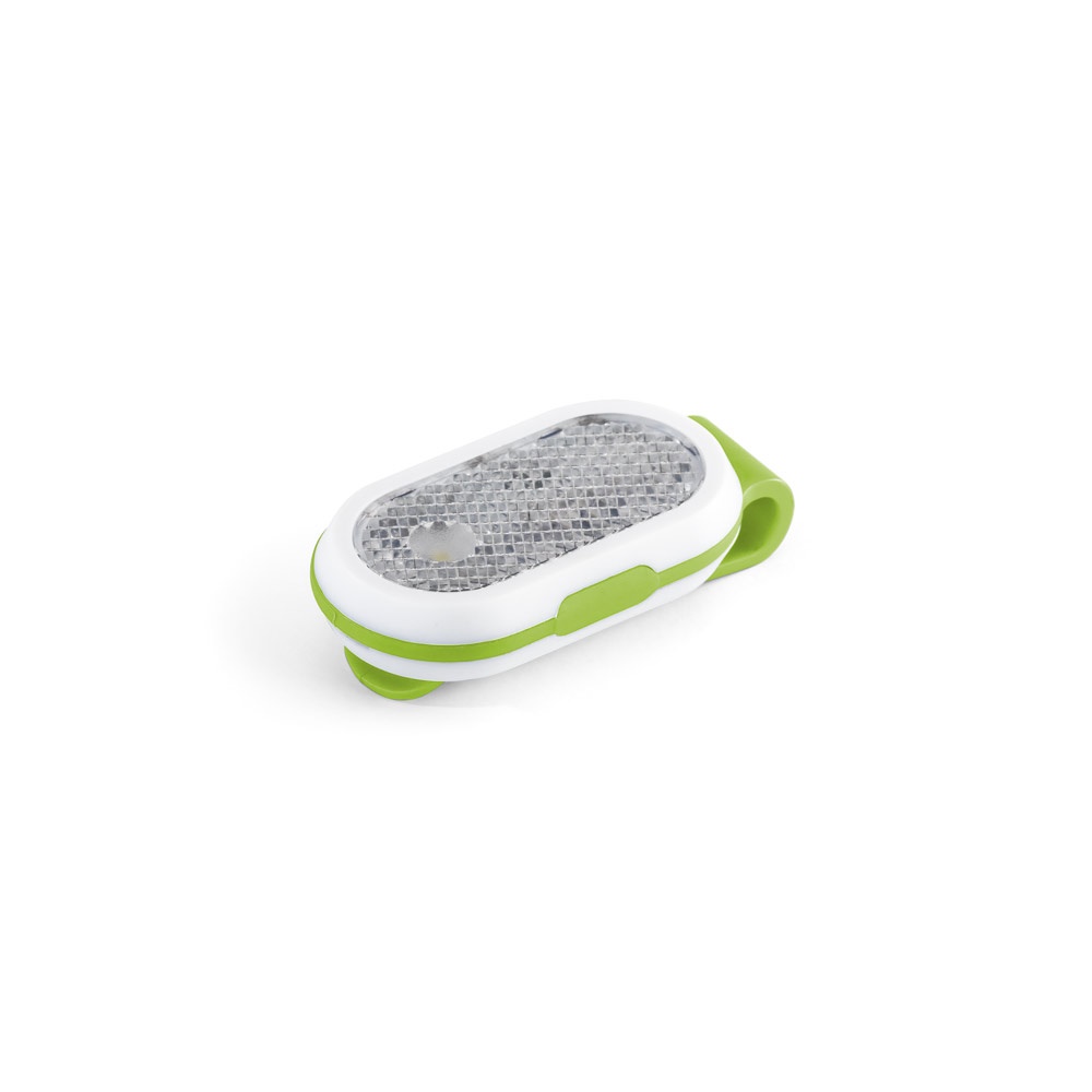 Luz reflectante fabricada en ABS con 2 LED, 2 modos de iluminación y clip trasero. Incluye 2 pilas CR1220