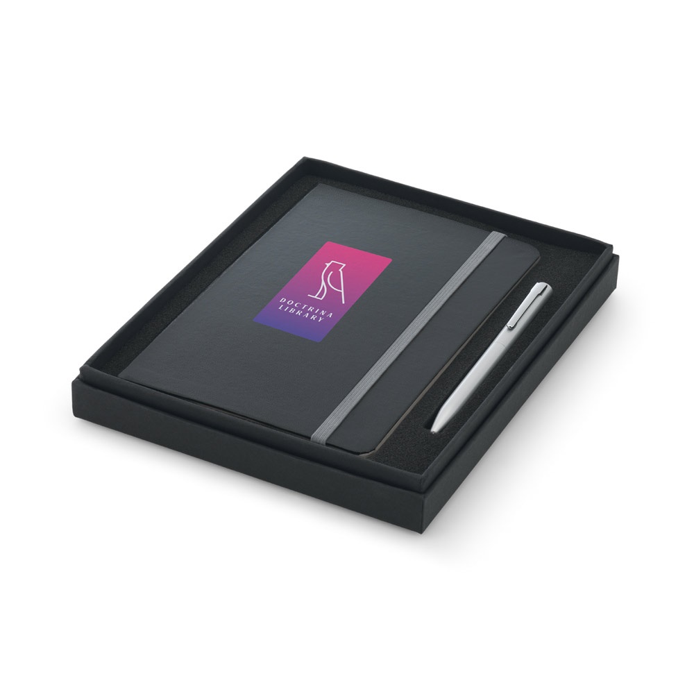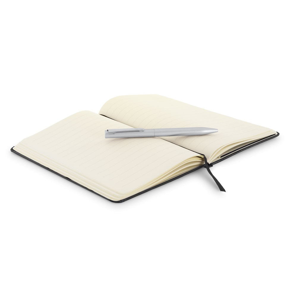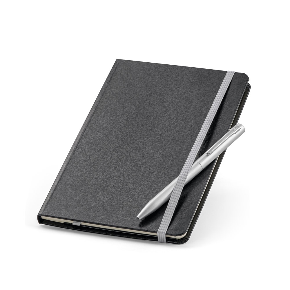 Set de bolígrafo y bloc de notas A5.El bolígrafo es de aluminio con clip metálico. El cuaderno A5 tiene tapa dura, cinta de separación, elástico, bolsillo interior y 160 páginas forradas en color marfil. Set suministrado en caja de regalo