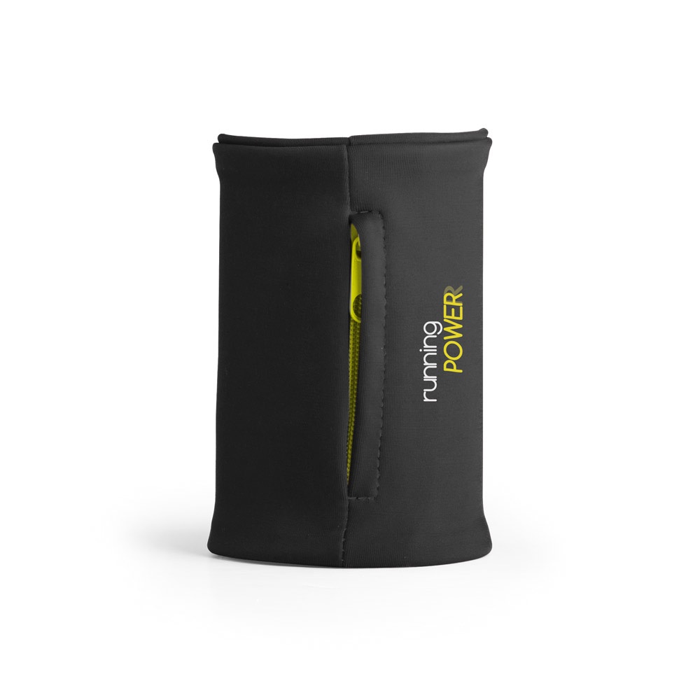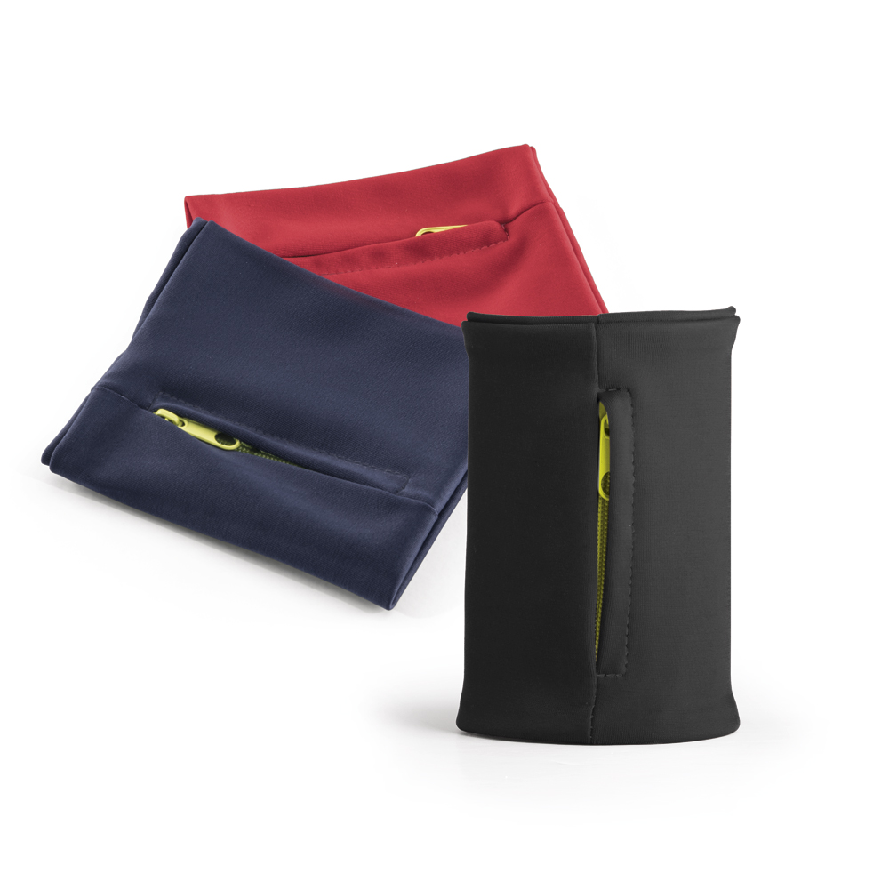 Muñequera elástica de poliéster con bolsillo de cierre de cremallera, ideal para guardar objetos pequeños y usar durante la práctica de deportes.100 x 100 mm
