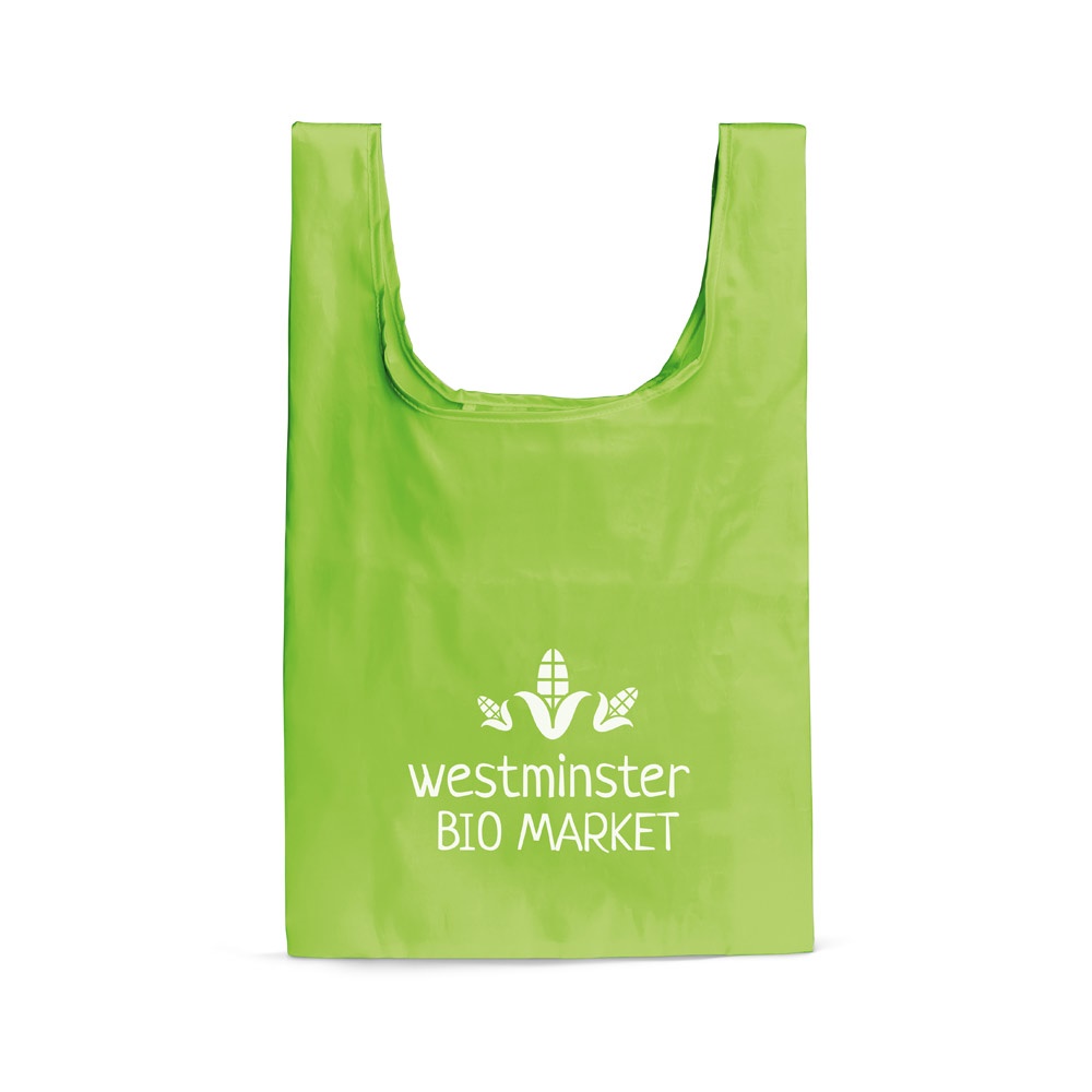 Bolsa plegable fabricada en poliéster 210D con asas de 70 cm y bolsillo interior. Se suministra desplegada