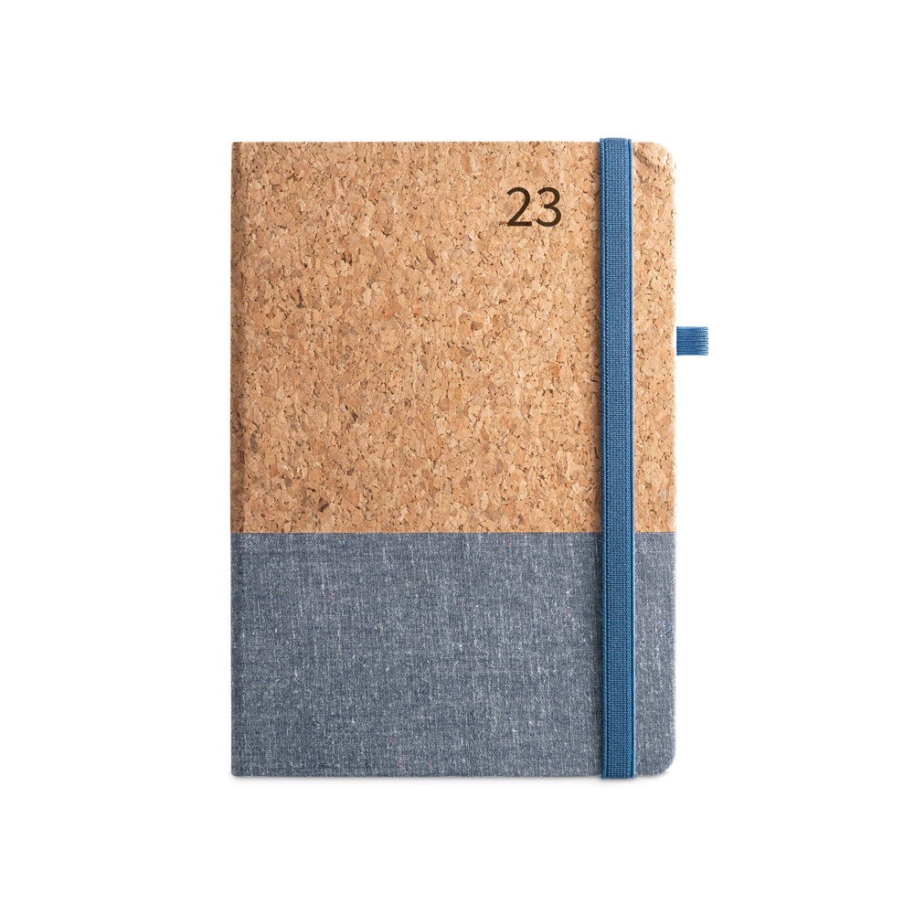 Agenda A5 en corcho y lino con soporte para bolígrafo y cierre con cinta elástica del mismo color. Se suministra con funda de non-woven. Bolígrafo no incluido