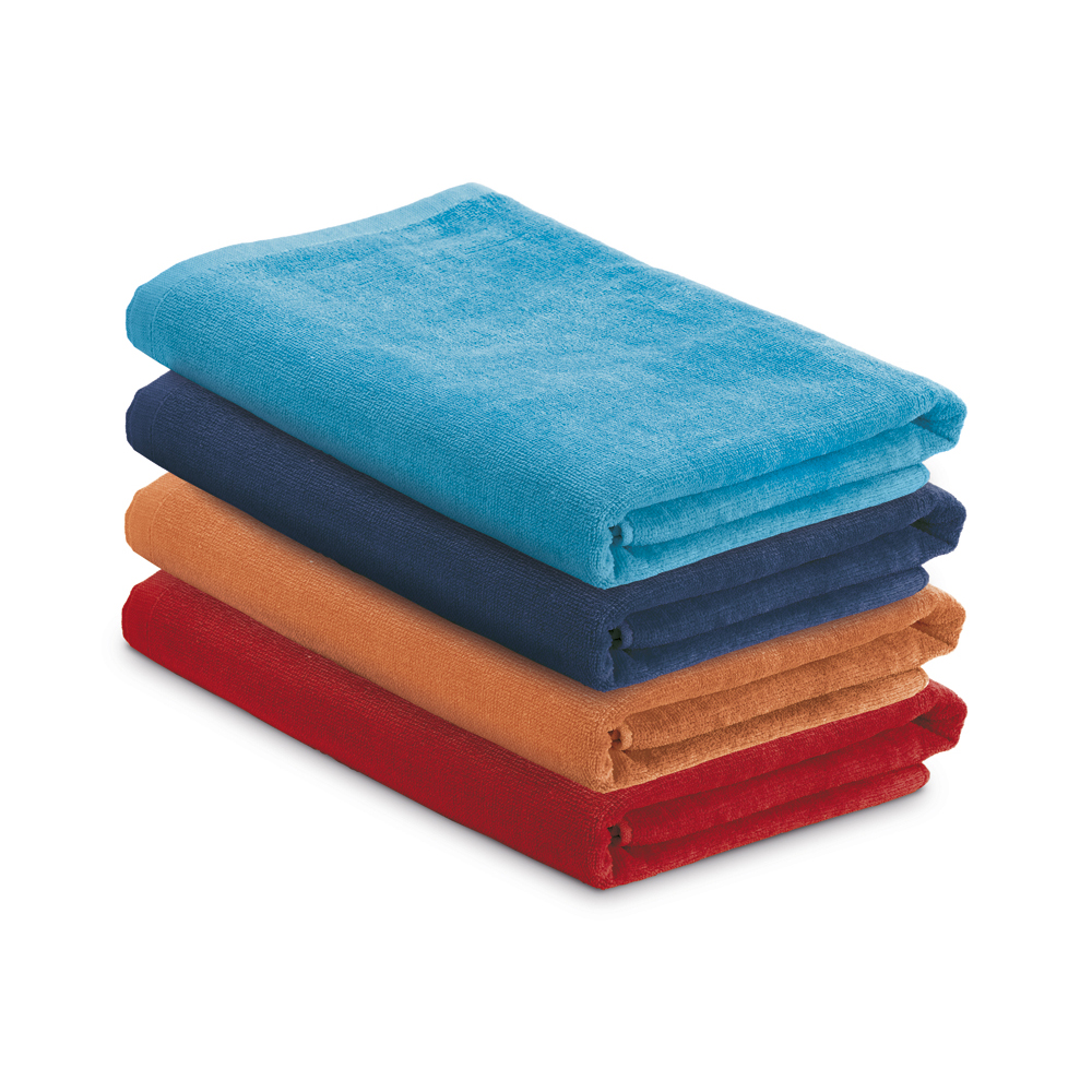 Toalla de playa hecha en terciopelo de algodón (320 g/m²). Se suministra en una bolsa de tela no tejida (non-woven 80 g/m²)