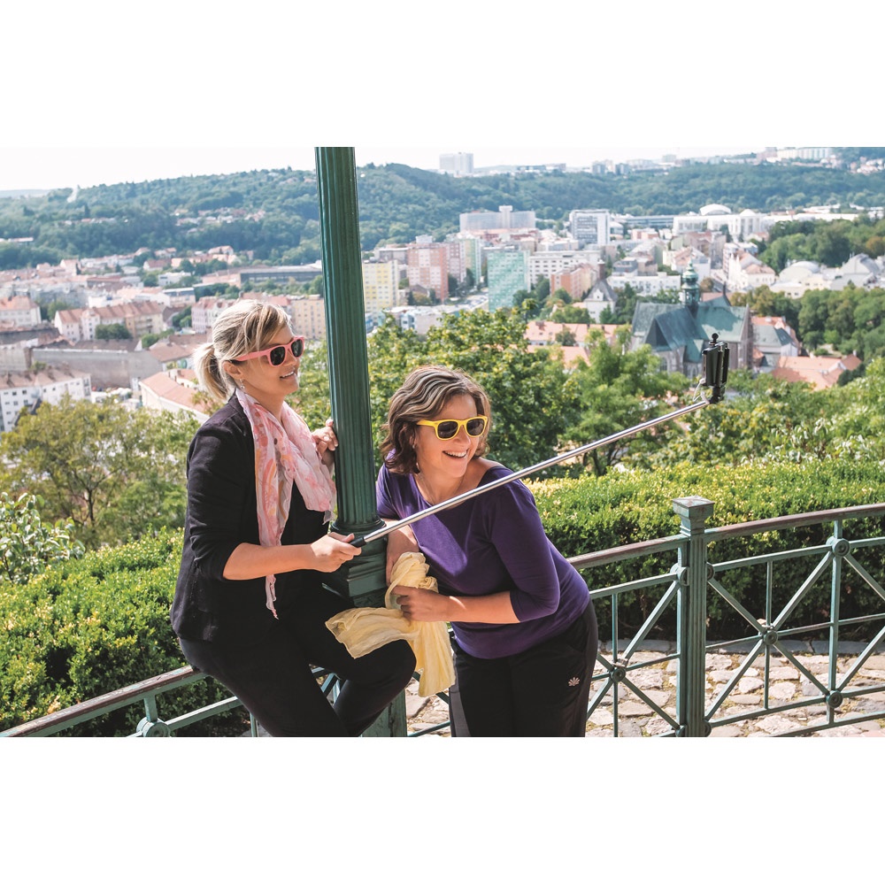 Monopod extensible de metal. Incluye un cable de conexión estéreo de 3,5 mm, un botón para el obturador y un asa en el extremo para facilitar el transporte
