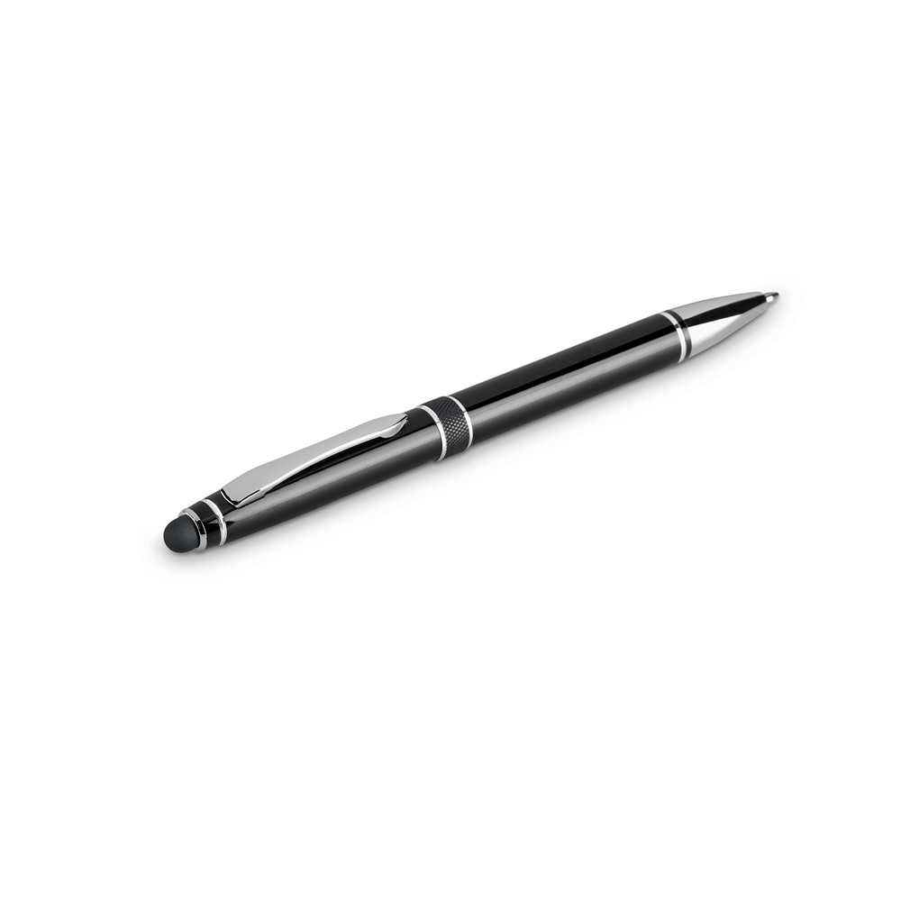 Bolígrafo de aluminio con mecanismo de giro, puntero táctil y clip. Escritura de color azul. Se entrega en estuche de papel kraft