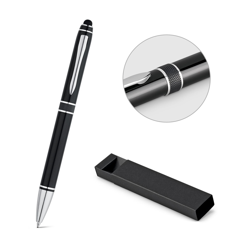 Bolígrafo de aluminio con mecanismo de giro, puntero táctil y clip. Escritura de color azul. Se entrega en estuche de papel kraft.ø11 x 138 mm | Estuche: 180 x 43 x 22 mm