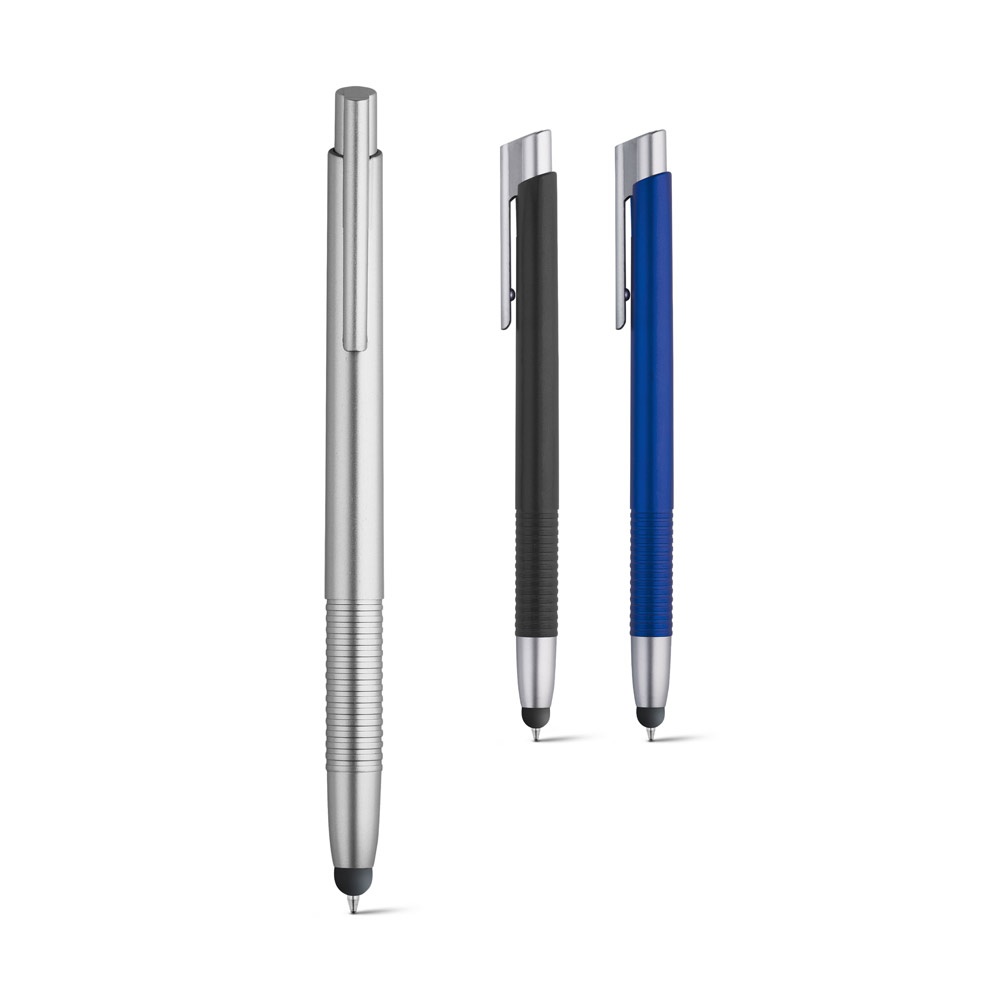 Bolígrafo con clip y detalle estriado en la zona de sujeción. Acabado metalizado y puntero táctil. Escritura de color azul.ø10 x 140 mm