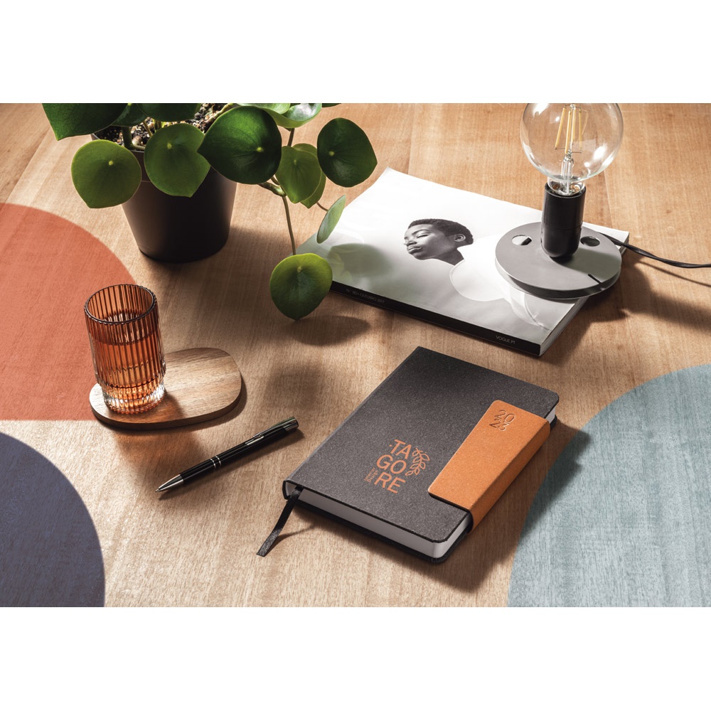 Agenda A5 en piel reciclada con cierre magnético. Con portalápices y marcador de cinta. Se suministra con una bolsa non-woven. Bolígrafo incluido
