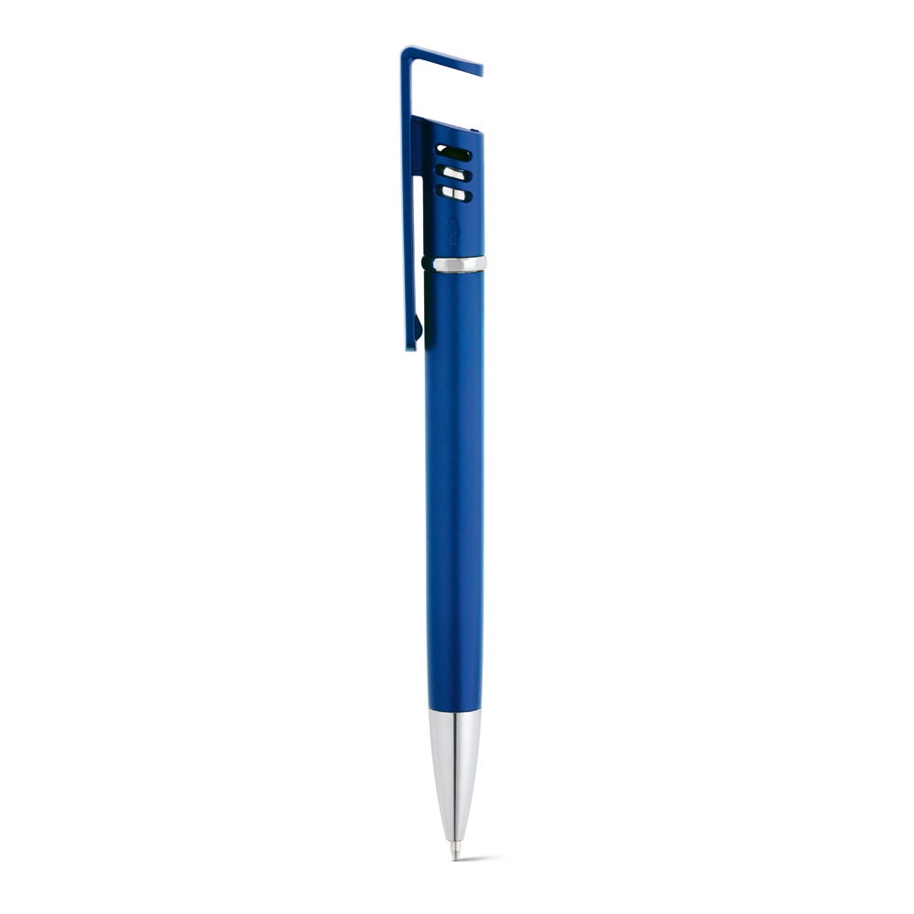 Bolígrafo multifunción con clip, puntero táctil y soporte para móvil. Acabado metalizado. Escritura en color azul