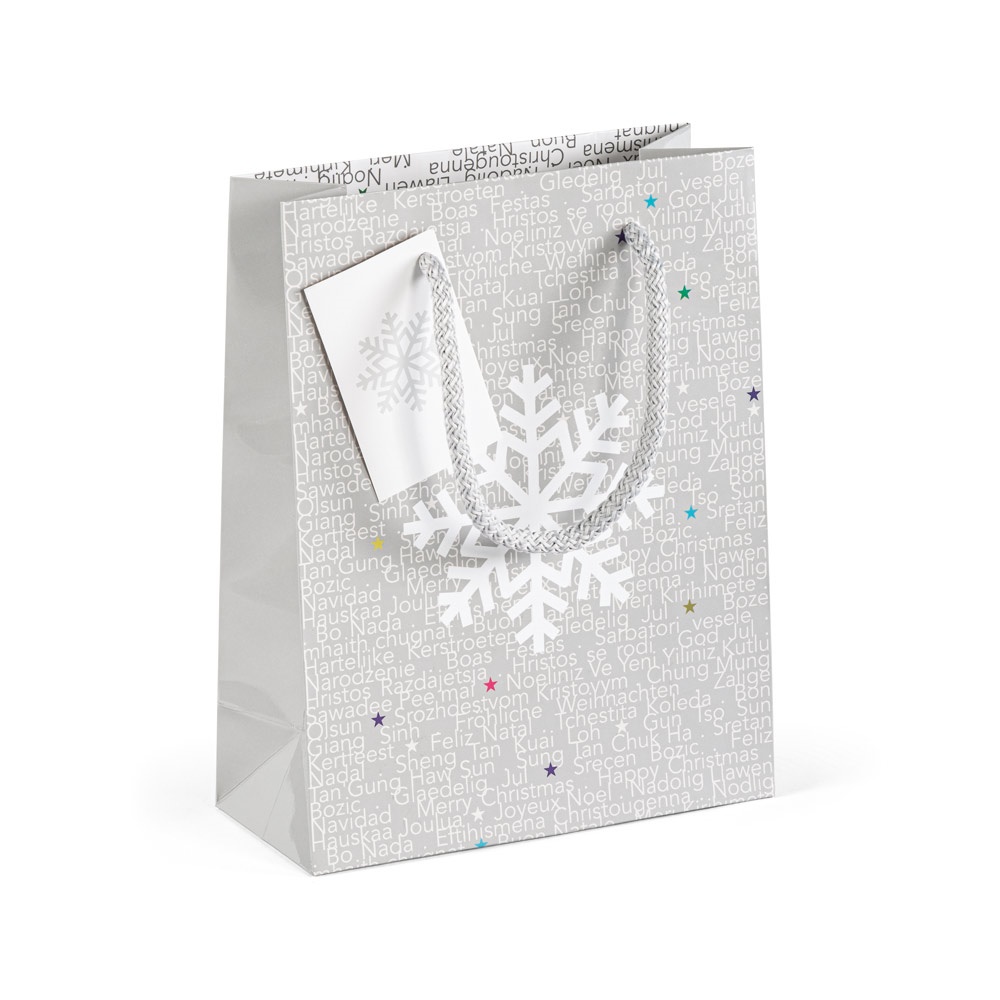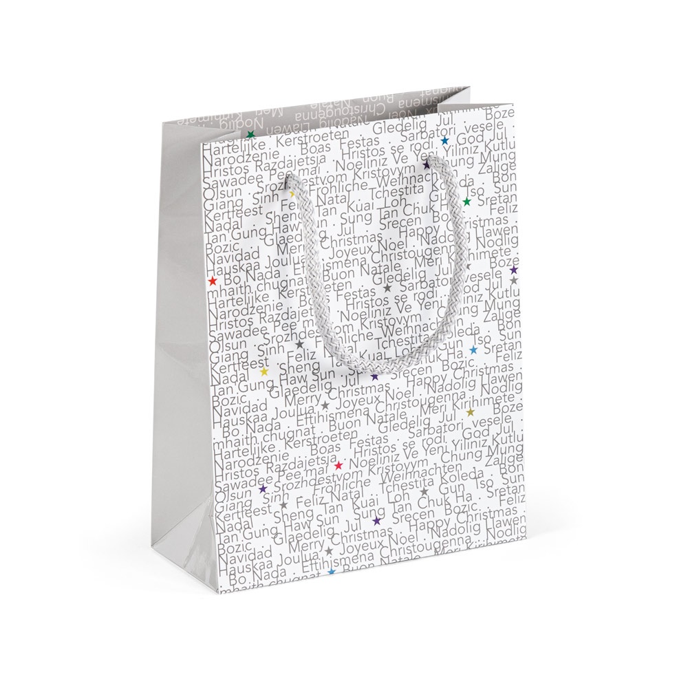 Bolsa pequeña de papel estucado con laminado brillante (170 g / m²). Fabricada en cartón y cartulina para personalización. 180 x 230 x 80 mm | Cordón: ø6 x 300 mm