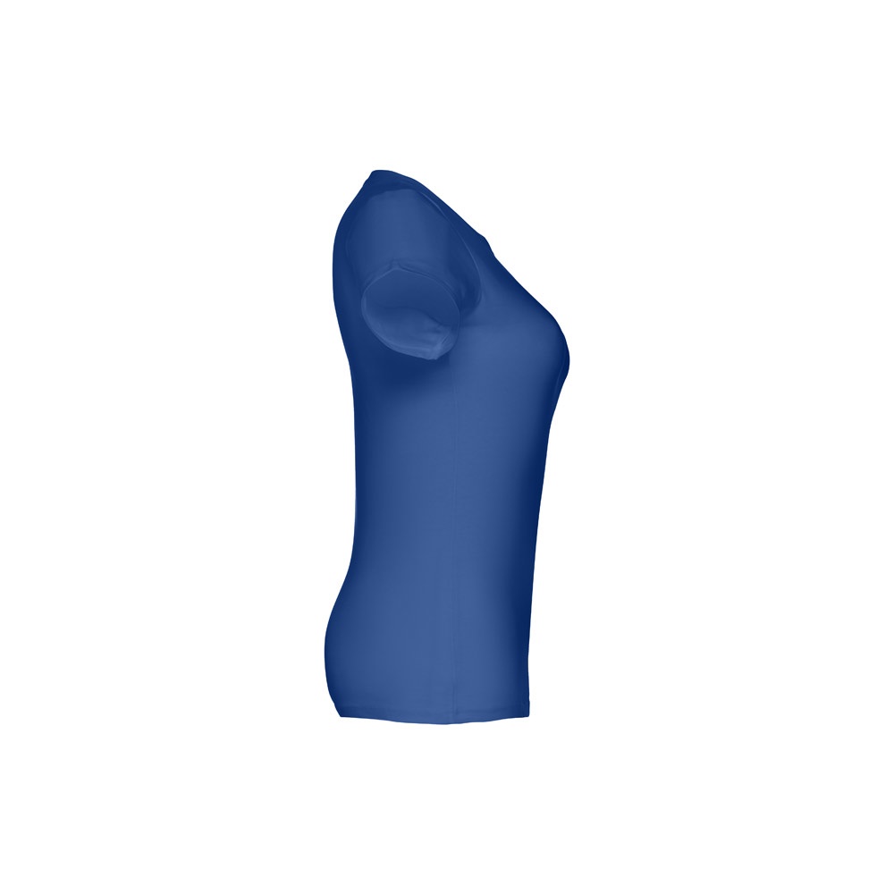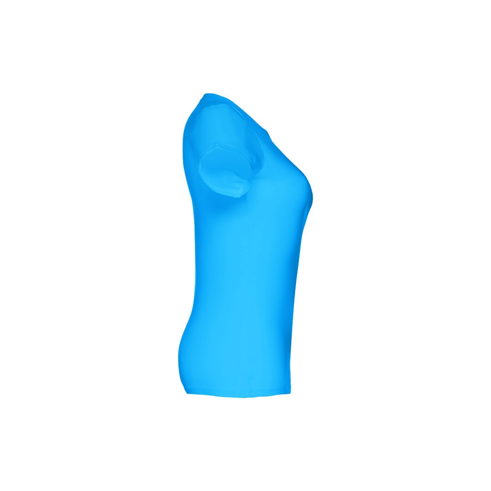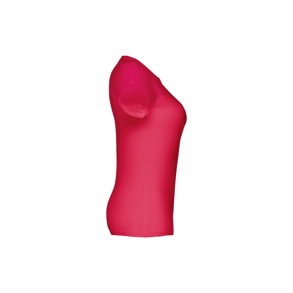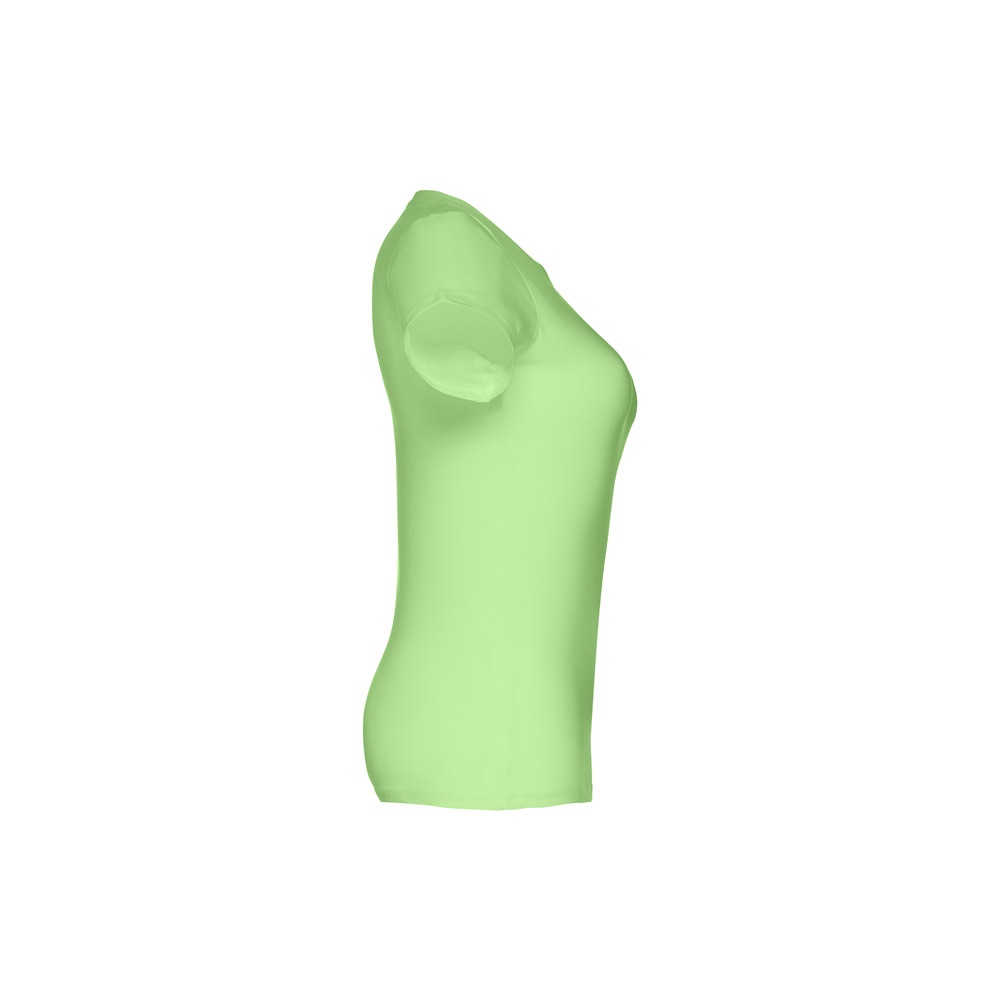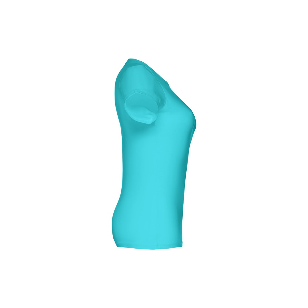 Camiseta entallada para mujer en punto jersey de algodón 100% (190 g/m²) con hilo de algodón cardado (color 183: 90% algodón y 10% viscosa). Tiene cuello de jersey fino con cinta de refuerzo de raso. Pieza cortada y cosida con doble costura en mangas y bajo
