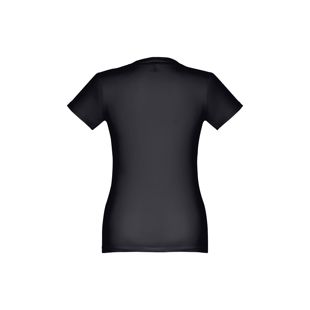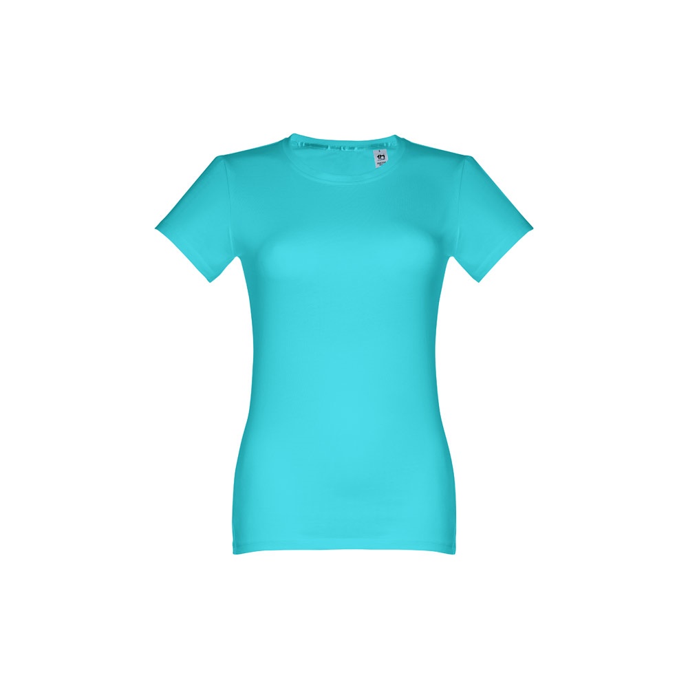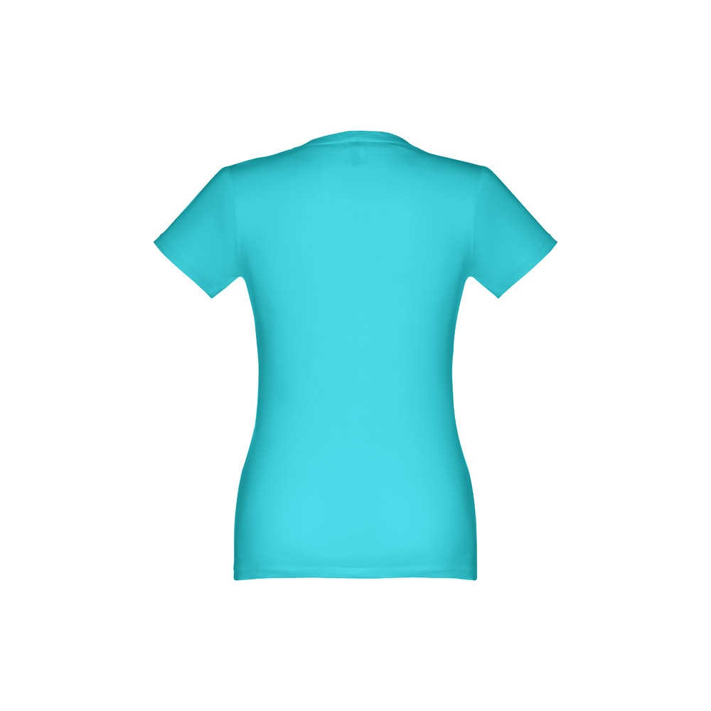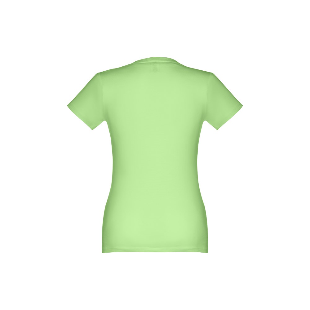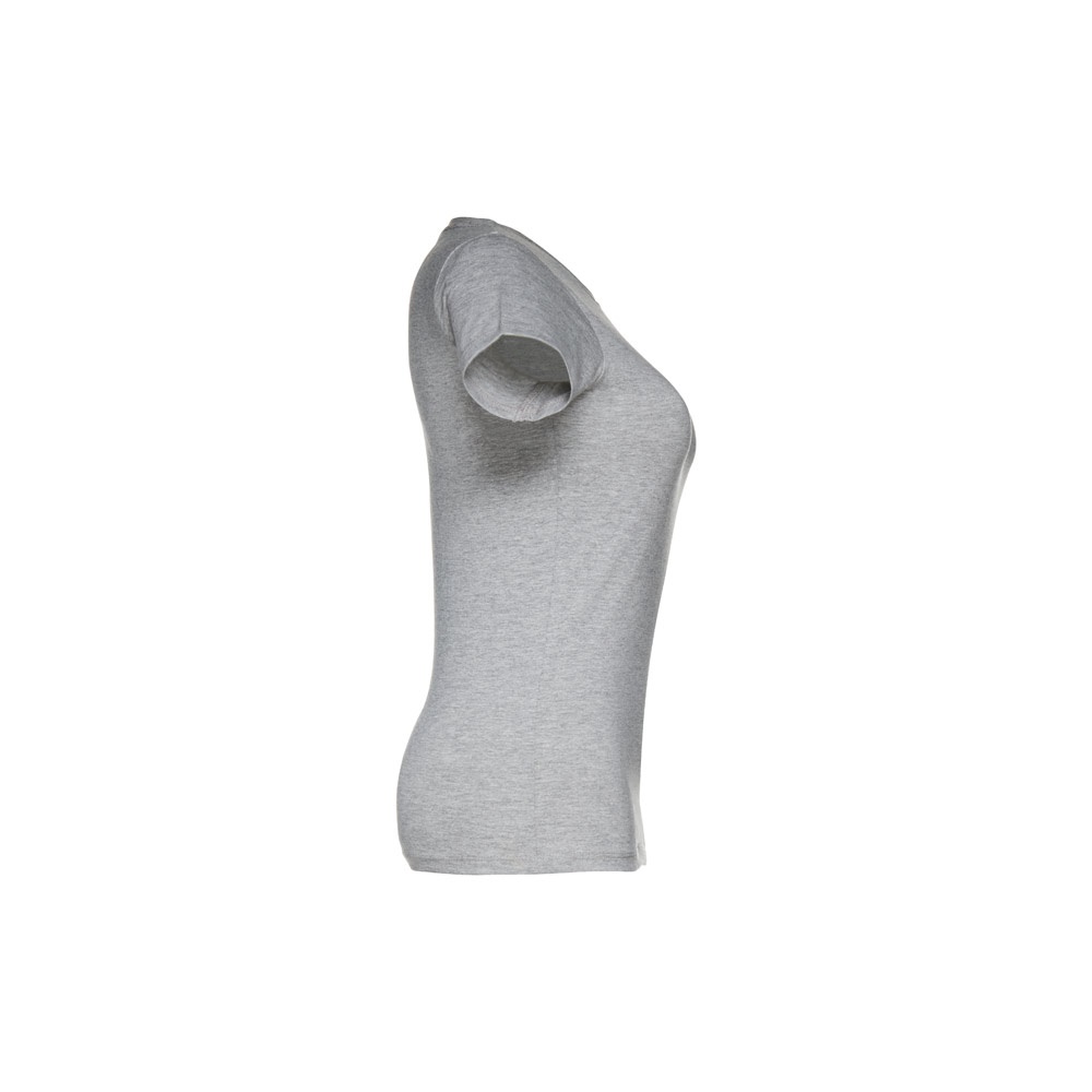 Camiseta entallada para mujer en punto jersey de algodón 100% (190 g/m²) con hilo de algodón cardado (color 183: 90% algodón y 10% viscosa). Tiene cuello de jersey fino con cinta de refuerzo de raso. Pieza cortada y cosida con doble costura en mangas y bajo