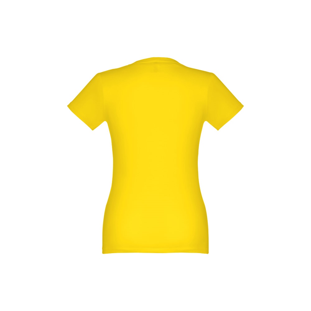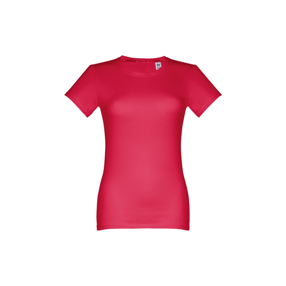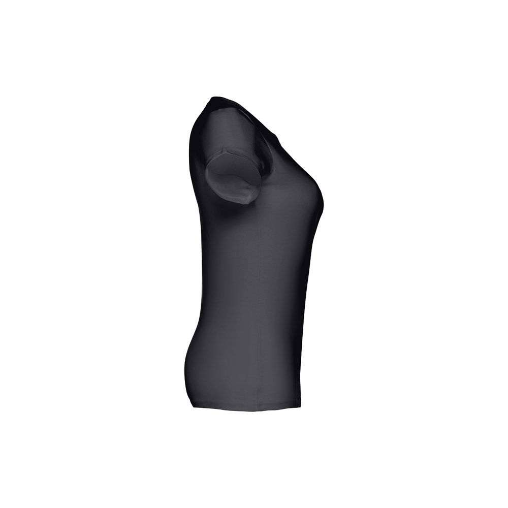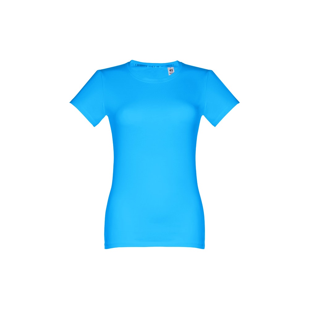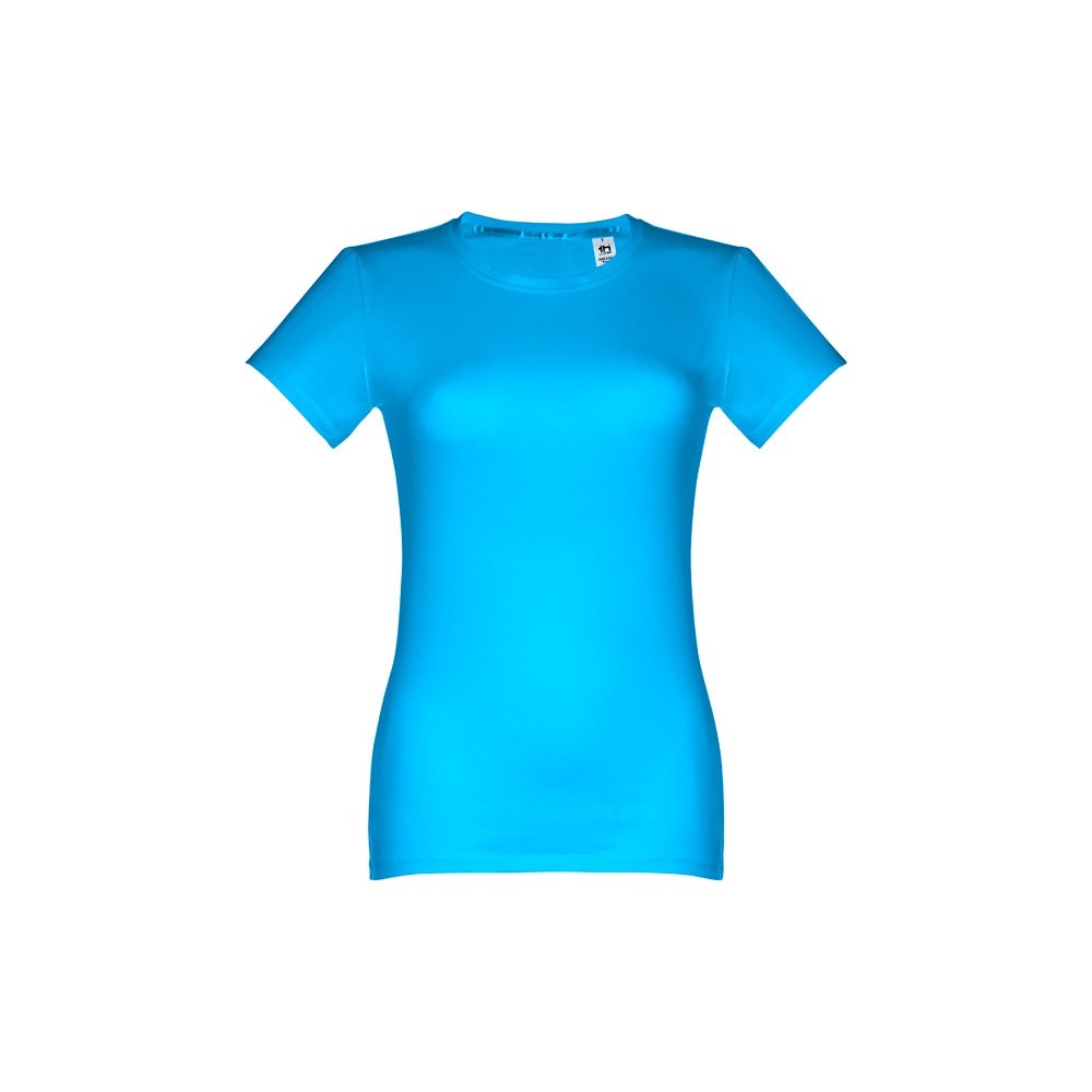 Camiseta entallada para mujer en punto jersey de algodón 100% (190 g/m²) con hilo de algodón cardado (color 183: 90% algodón y 10% viscosa). Tiene cuello de jersey fino con cinta de refuerzo de raso. Pieza cortada y cosida con doble costura en mangas y bajo