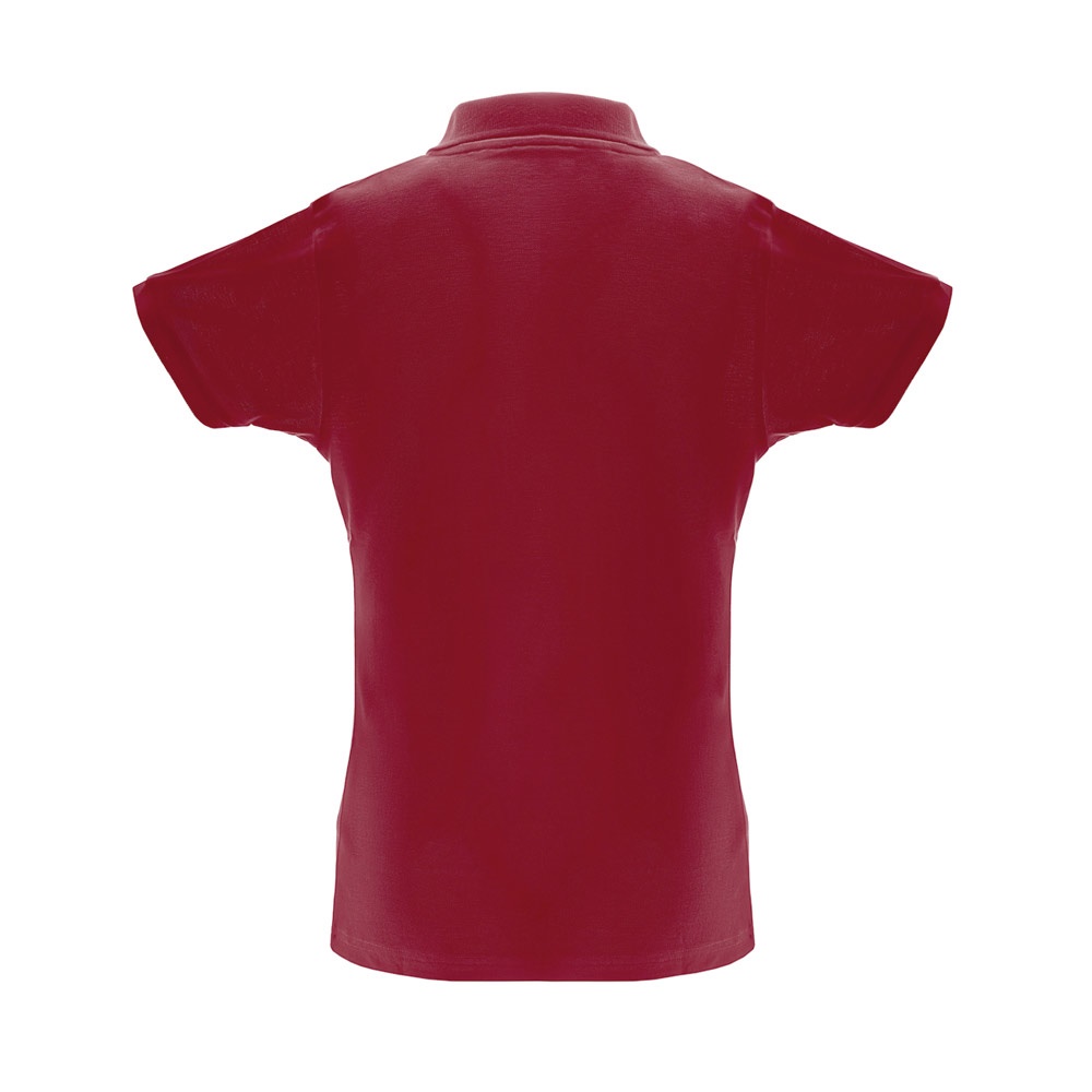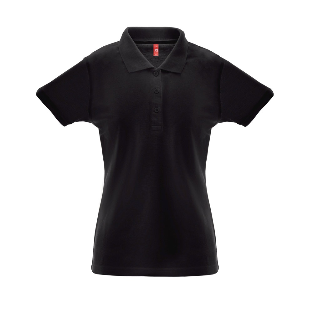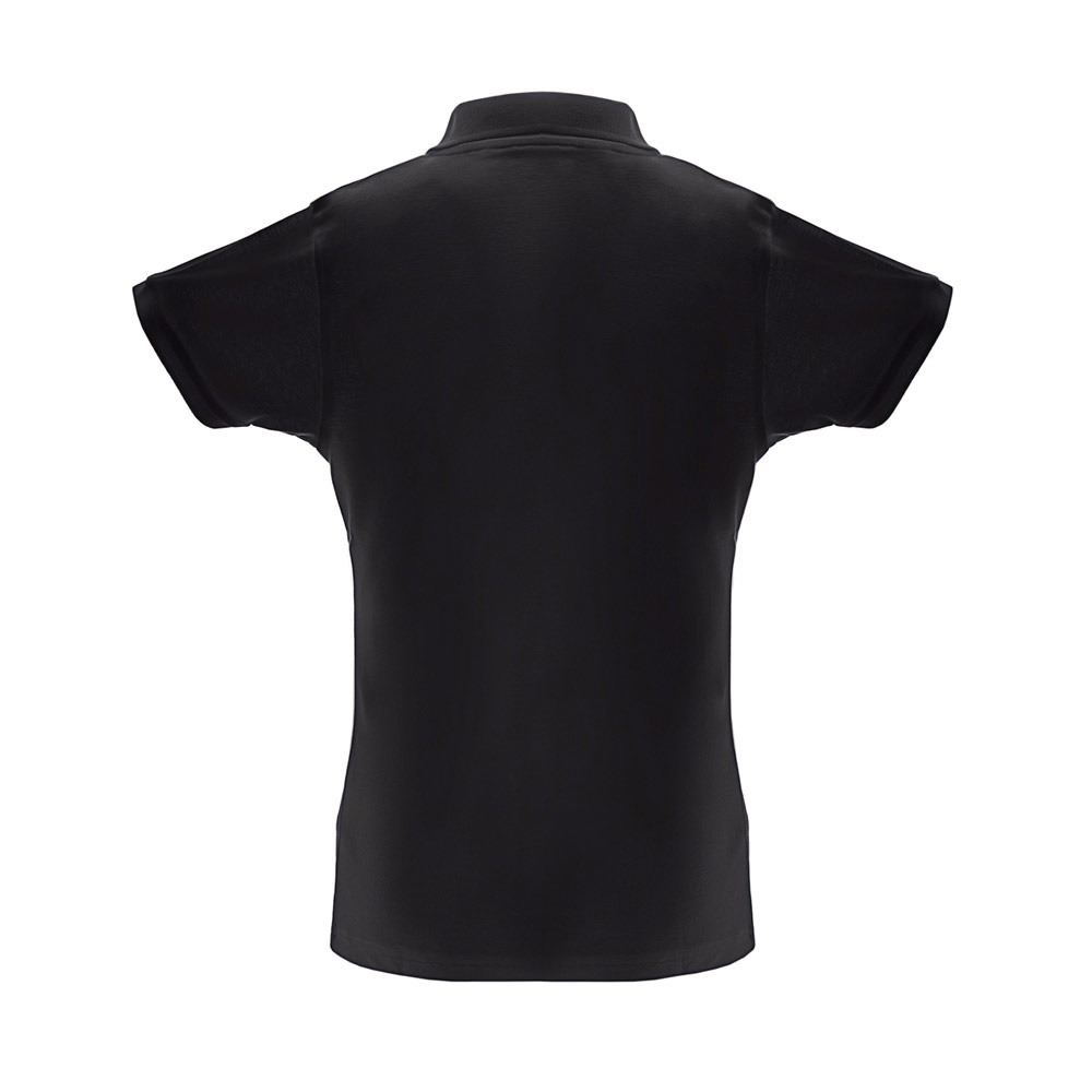 Polo de mujer de manga corta en punto piqué 35% algodón y 65% poliéster (200 g / m²) (color: 183: 85% algodón / 15% viscosa). Polo de corte cinturón con cuello y mangas de canalé, Cuello reforzado con cinta de malla de piqué. Contiene tapeta reforzada con 3 botones de colores (botón alternativo disponible en la costura interior). Pieza cortada y cosida