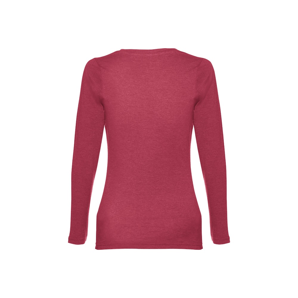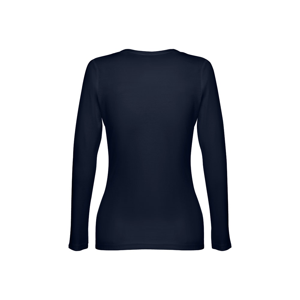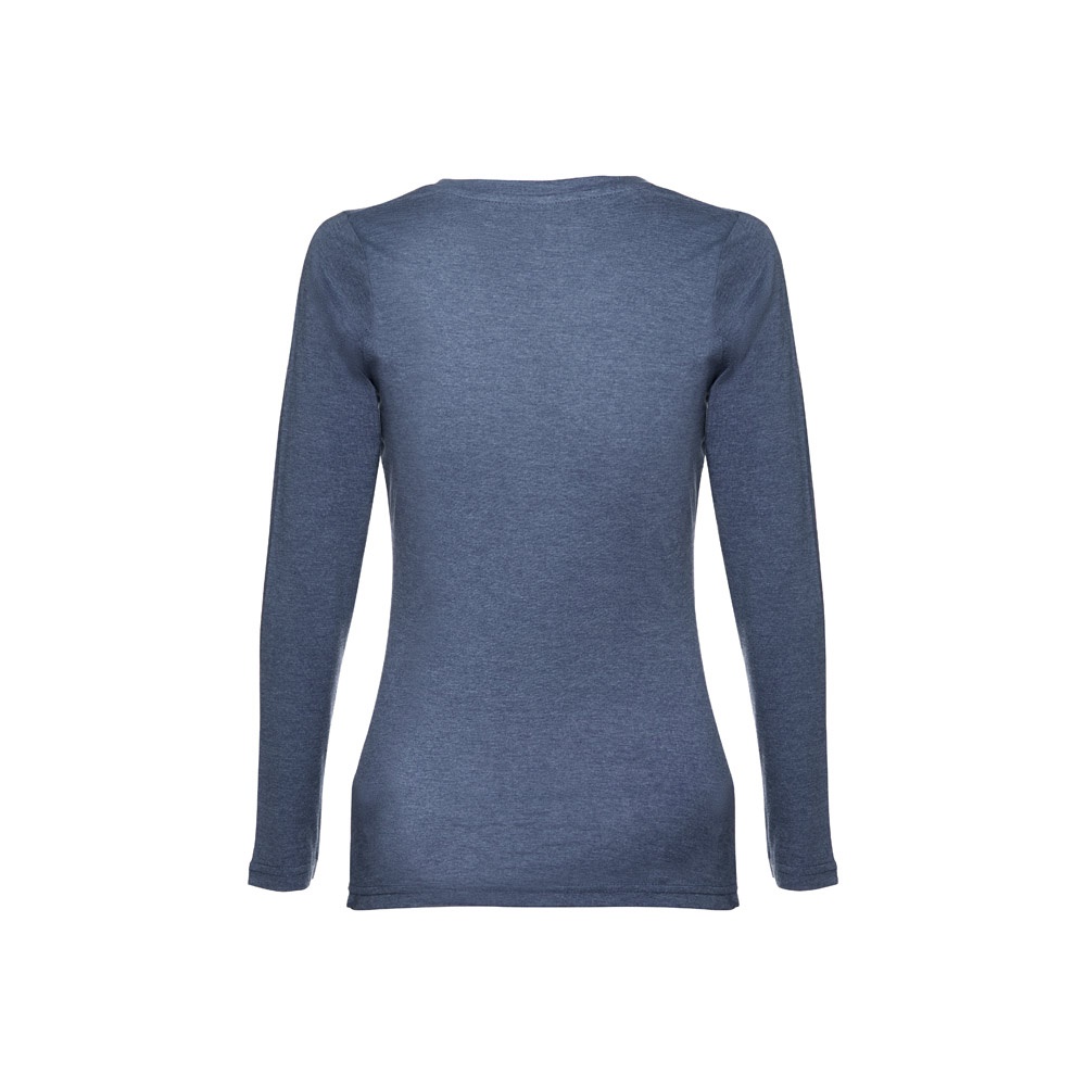Camiseta de mujer de manga larga con corte ajustado en punto jersey de algodón 100% (150 g/m²) con hilo de algodón cardado (colores: 194, 195: 60% algodón/40% poliéster, color 183: 90% algodón/10% viscosa). Tiene un corte moderno con cuello de jersey reforzado. Pieza cortada y cosida con doble costura en mangas y bajo