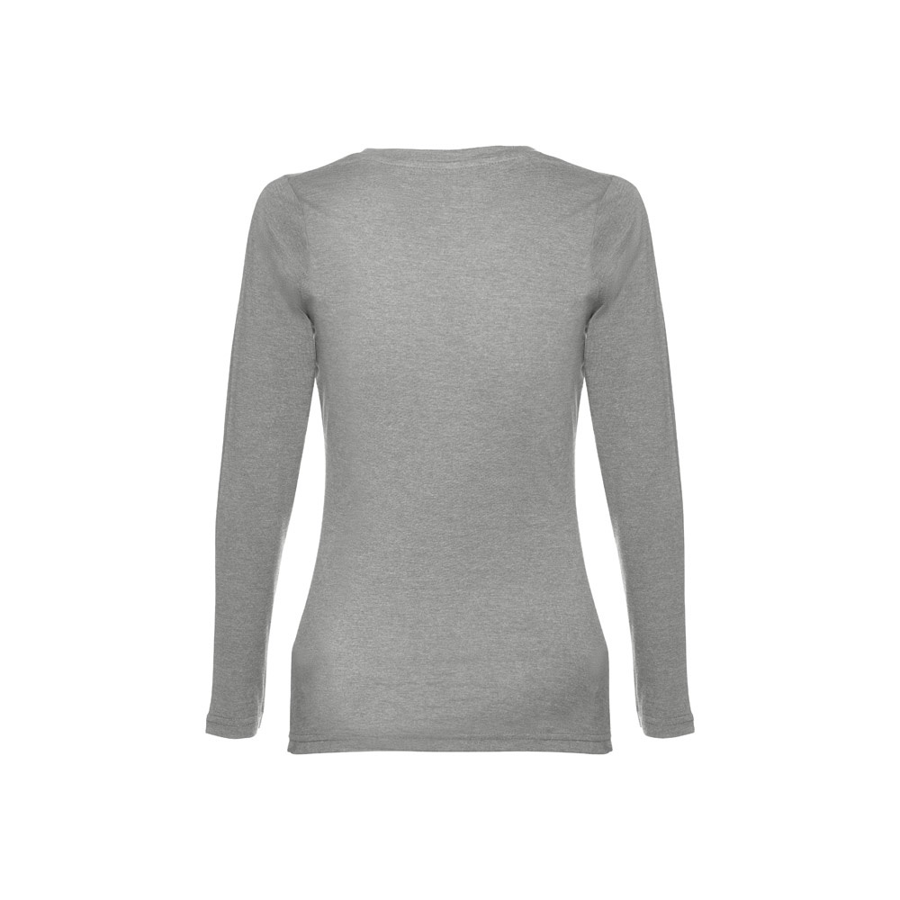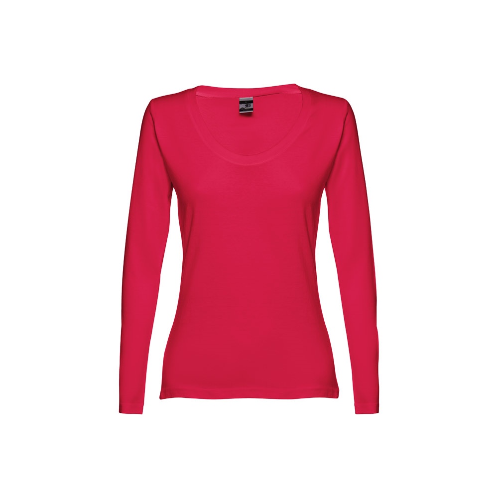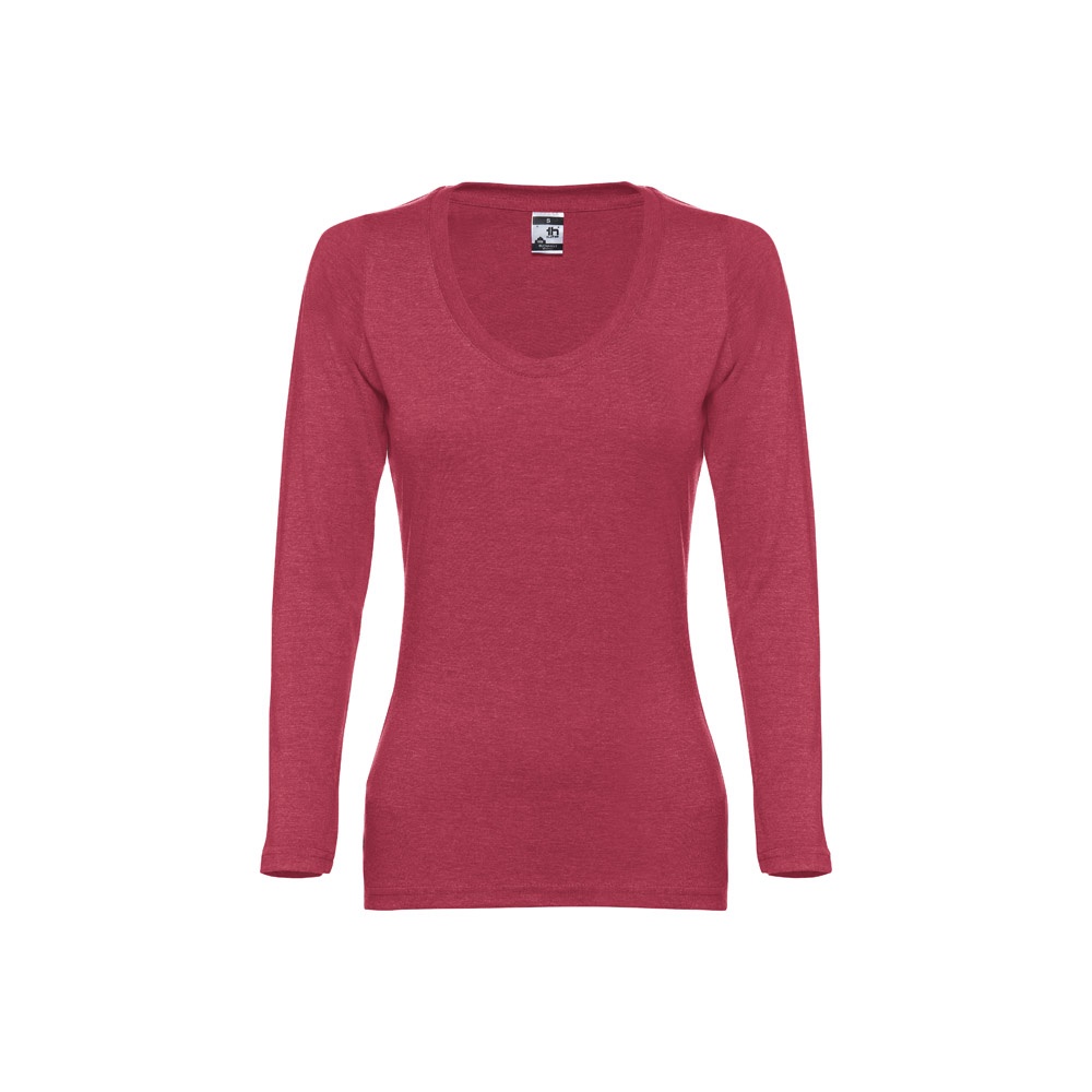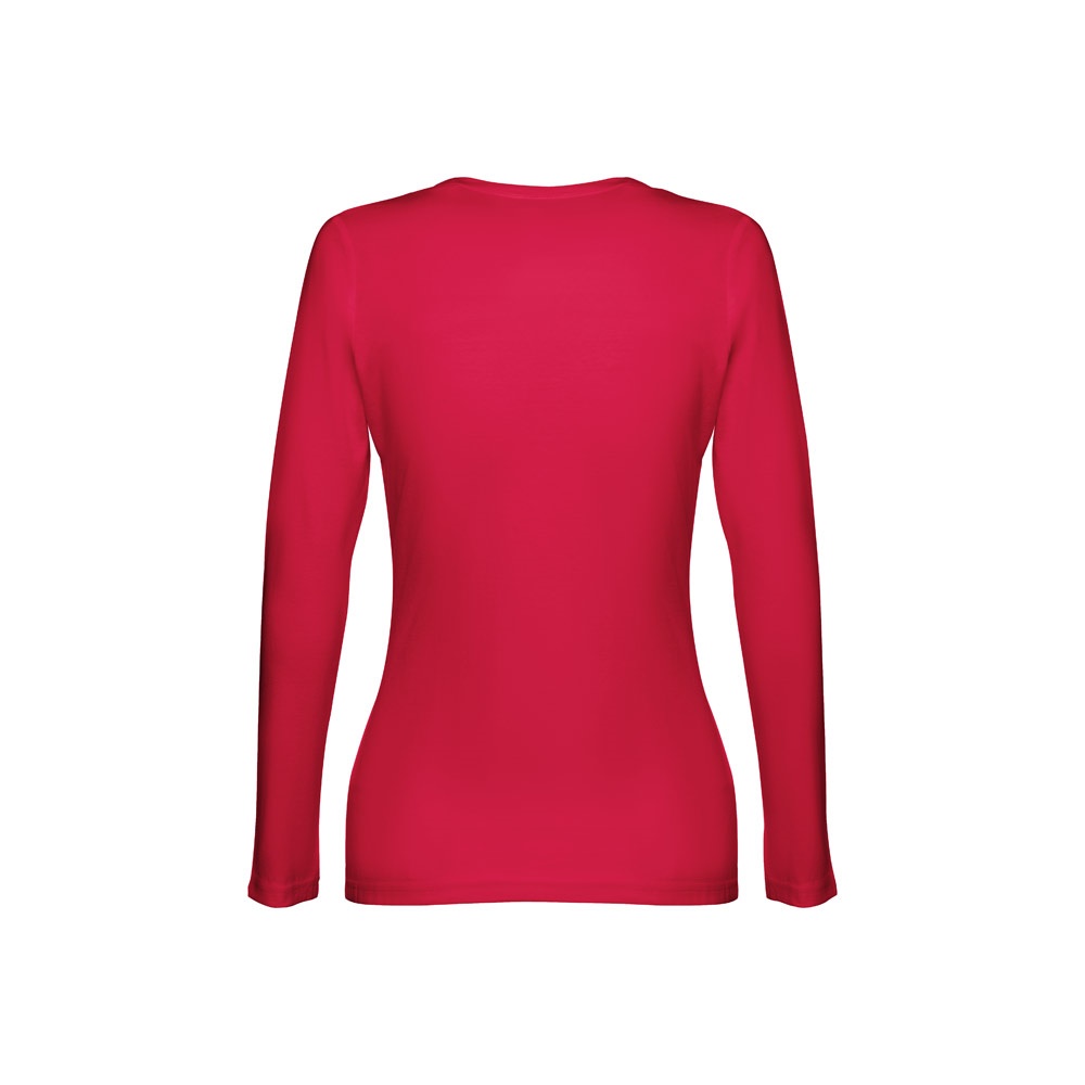 Camiseta de mujer de manga larga con corte ajustado en punto jersey de algodón 100% (150 g/m²) con hilo de algodón cardado (colores: 194, 195: 60% algodón/40% poliéster, color 183: 90% algodón/10% viscosa). Tiene un corte moderno con cuello de jersey reforzado. Pieza cortada y cosida con doble costura en mangas y bajo