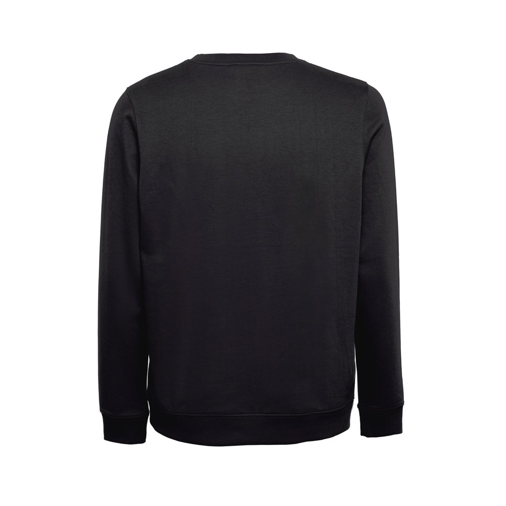 Sudadera (unisex) en felpa italiana sin cardar: 50% algodón y 50% poliéster (240 g / m²). Cuello, puños y cinturilla de canalé y cinta de refuerzo en el interior del cuello.Tallas: S, M, L, XL, XXL, 3XL
